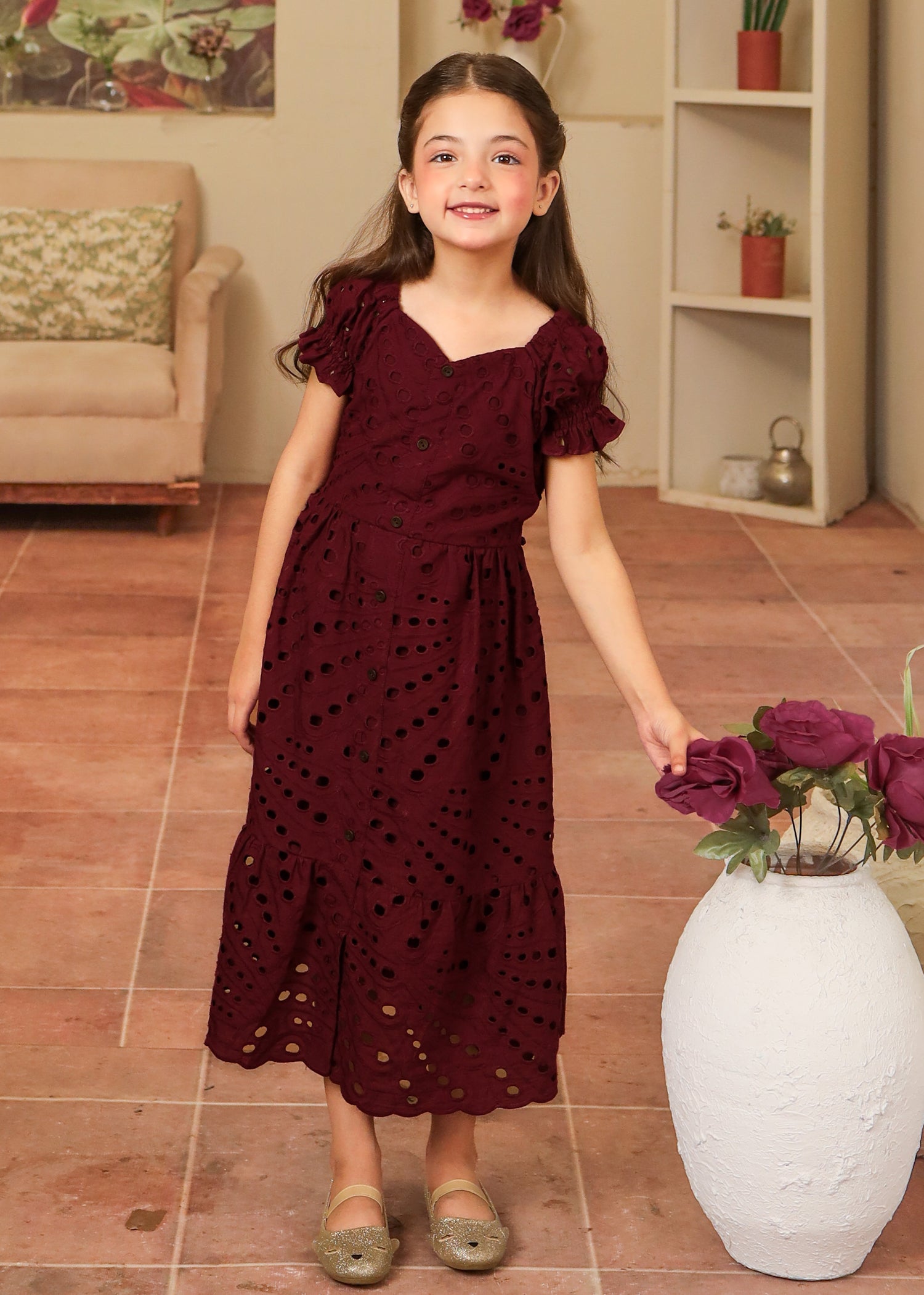 Crafted from flowing maroon eyelet fabric, this dress features a captivating sweetheart neckline with button details along the length of the dress. Short enchanting puffy elastic sleeves add a touch of romance, while the skirt is beautifully finished with intricate scallop edges, adding a dreamy charm to every step.