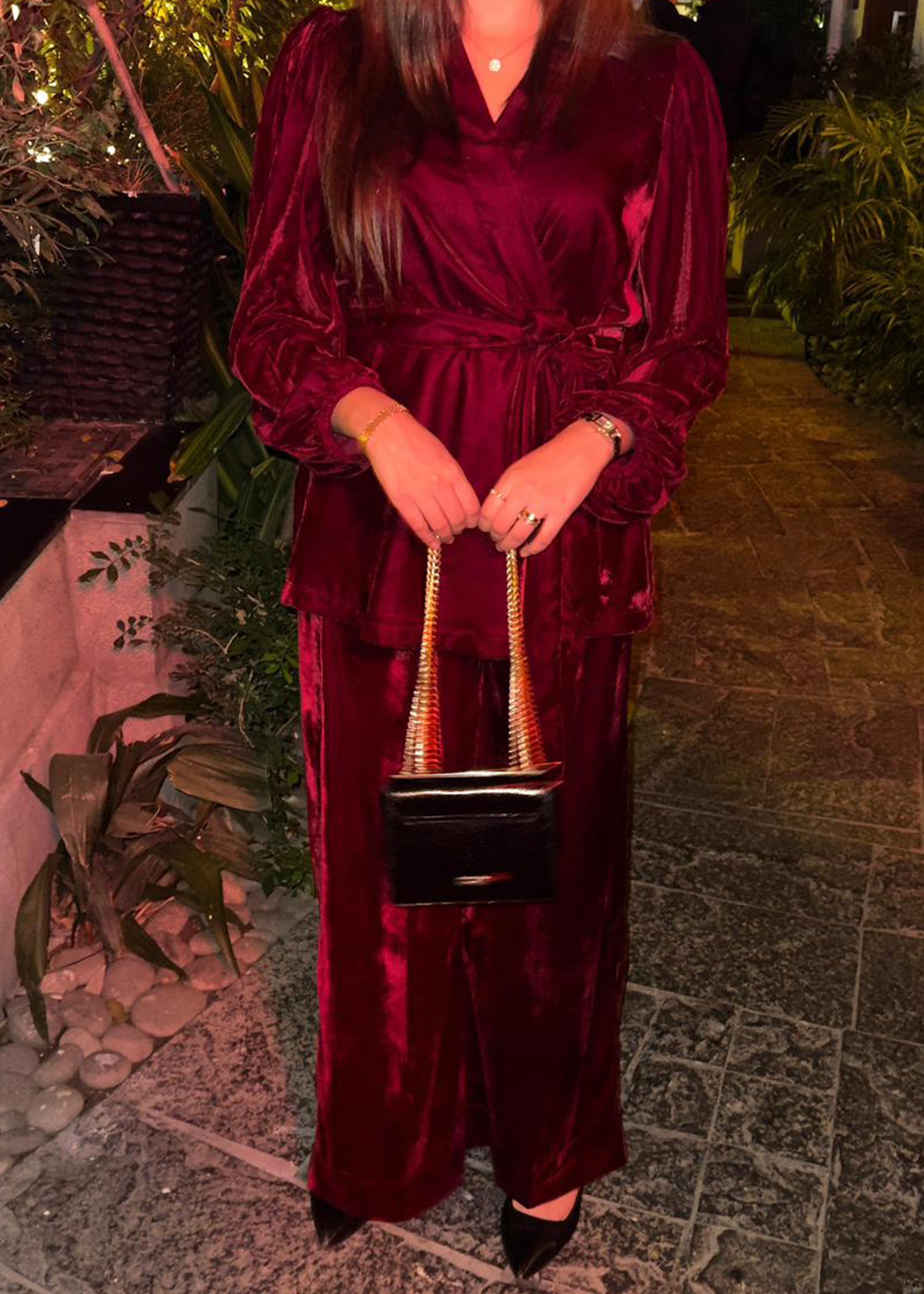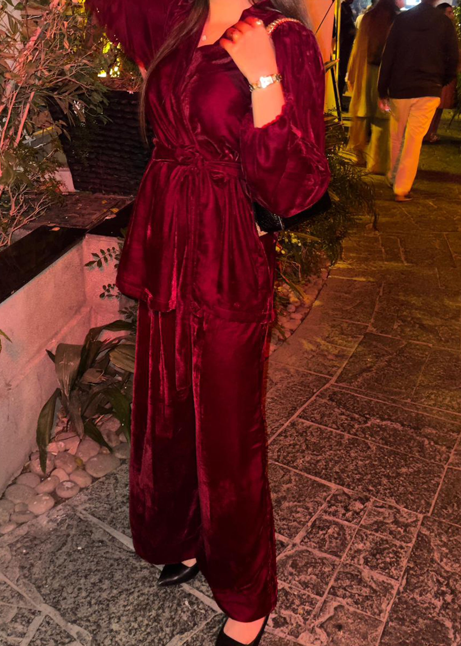 Rich, regal, and irresistibly soft — this maroon velvet co-ord set is designed to make every winter evening feel special. The top features dreamy full sleeves with a flowy, feminine silhouette and a flattering wrap-style bodice that ties at the waist for a perfectly cinched look. Paired with wide-leg velvet trousers, the set creates an effortlessly elegant, elongated silhouette with a beautiful drape and luxurious shine. Perfect for dinners, holiday events, and winter nights out, this co-ord stands out with its deep maroon hue and plush texture, giving you a look that’s both bold and timeless.