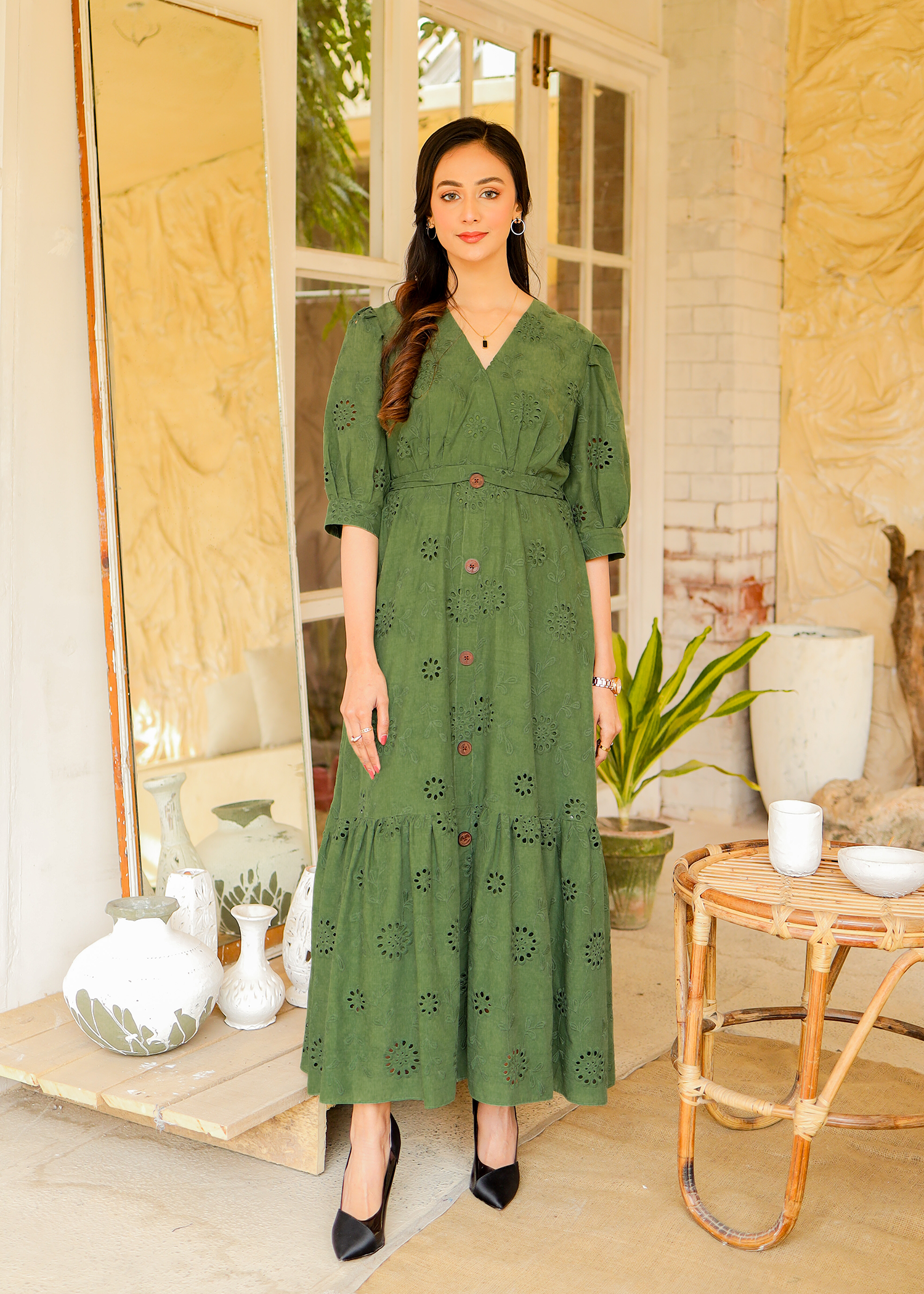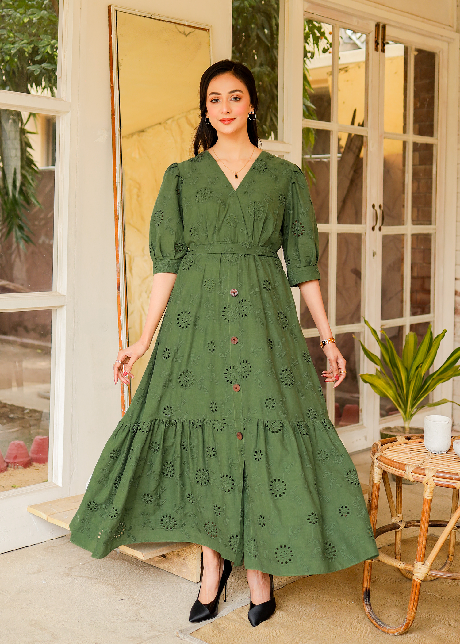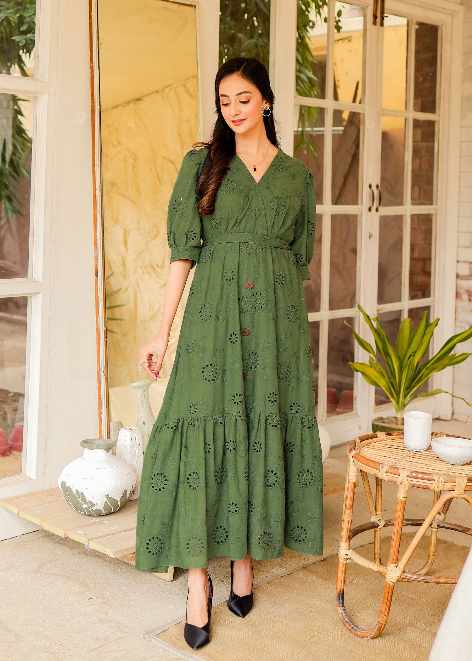 Introducing our Sage Dress, with a pleated wrap neckline and loose-fit puffy sleeves, this dress exudes effortless elegance. The bottom long frill adds a touch of movement, while the open button style on the skirt lends a hint of allure.