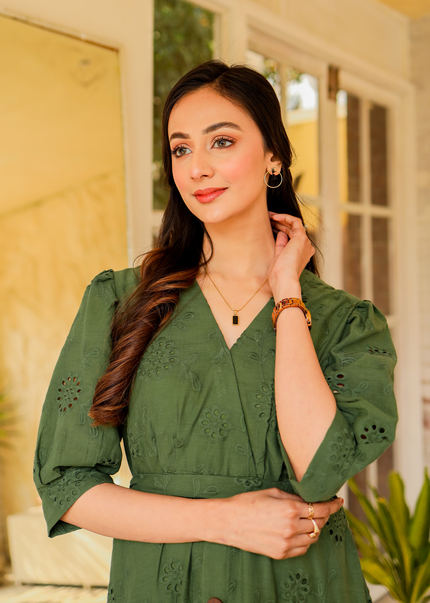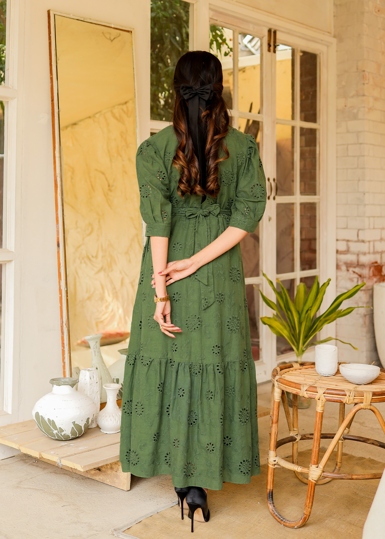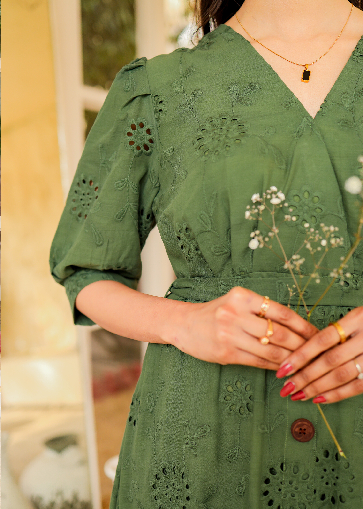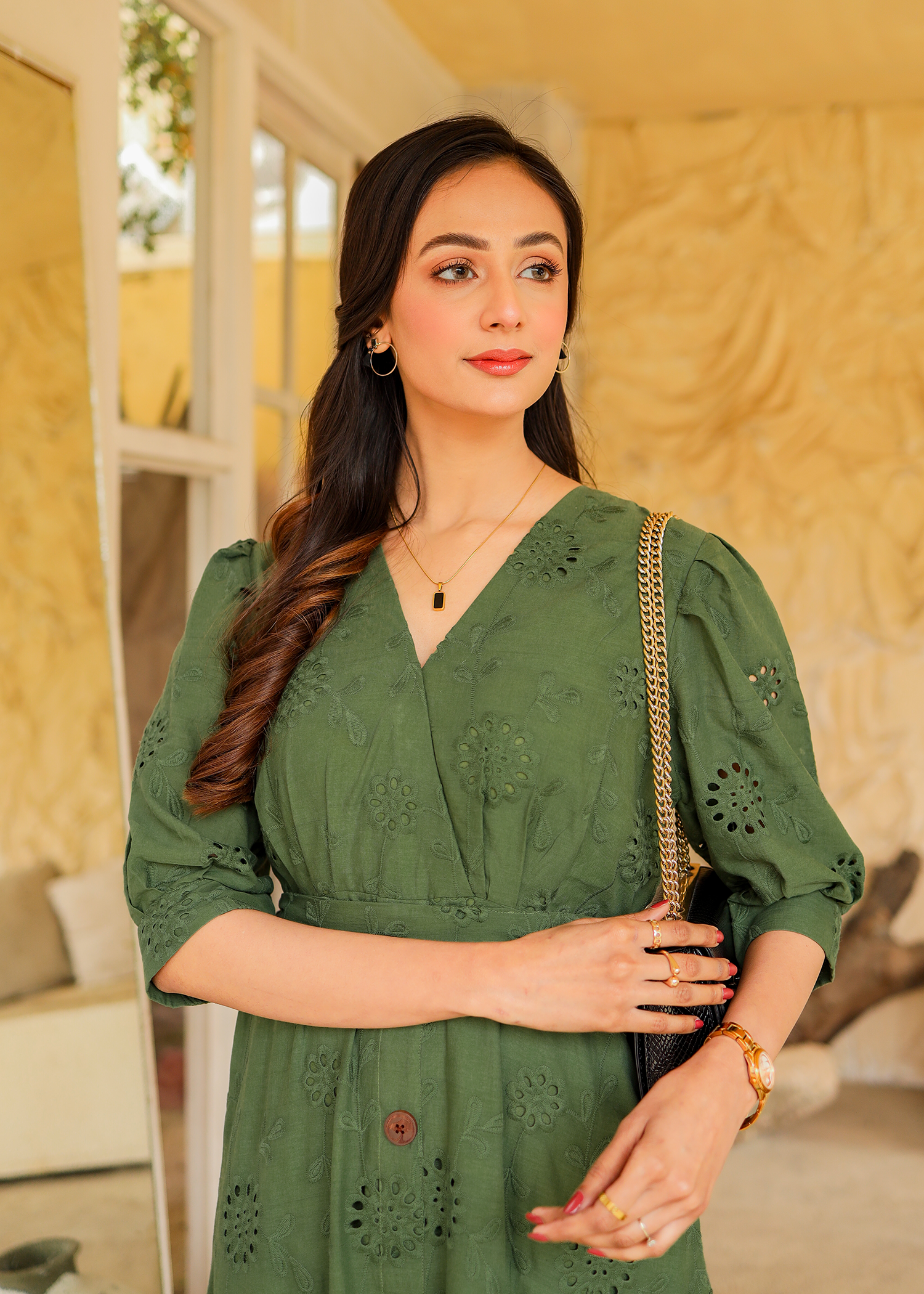 Introducing our Sage Dress, with a pleated wrap neckline and loose-fit puffy sleeves, this dress exudes effortless elegance. The bottom long frill adds a touch of movement, while the open button style on the skirt lends a hint of allure.