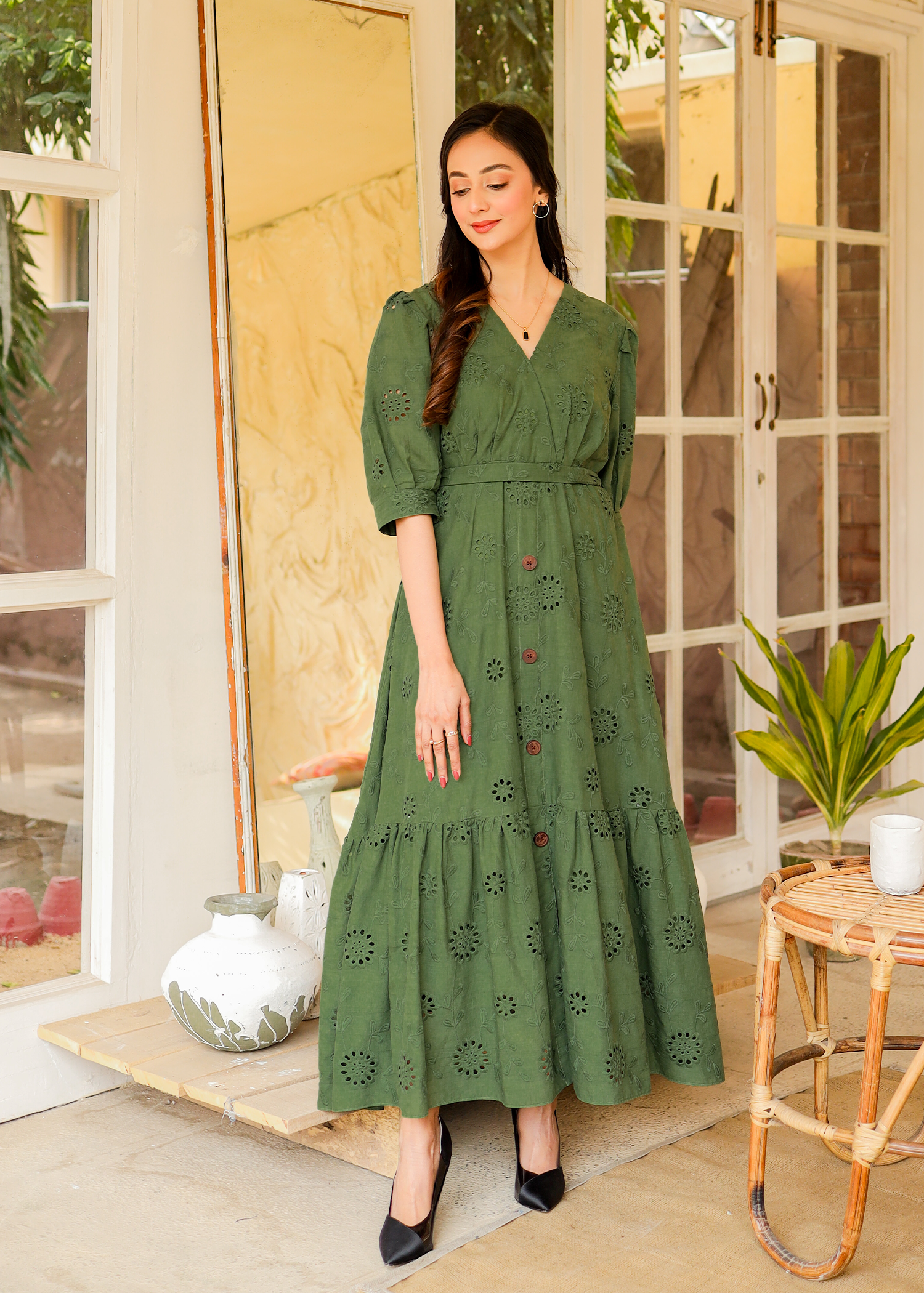 Fabric of the dress is eyelet (chikankari) with attached lining.