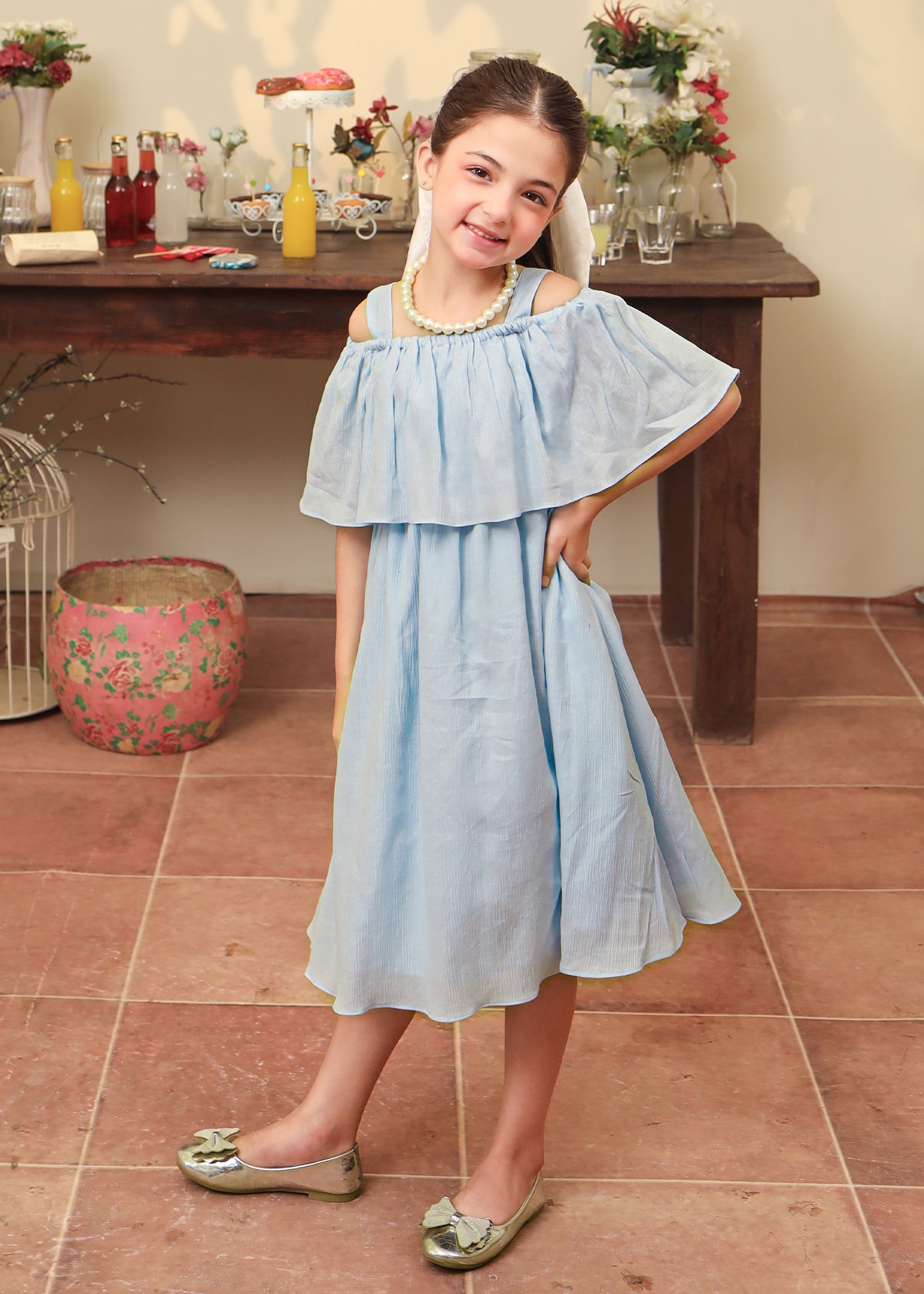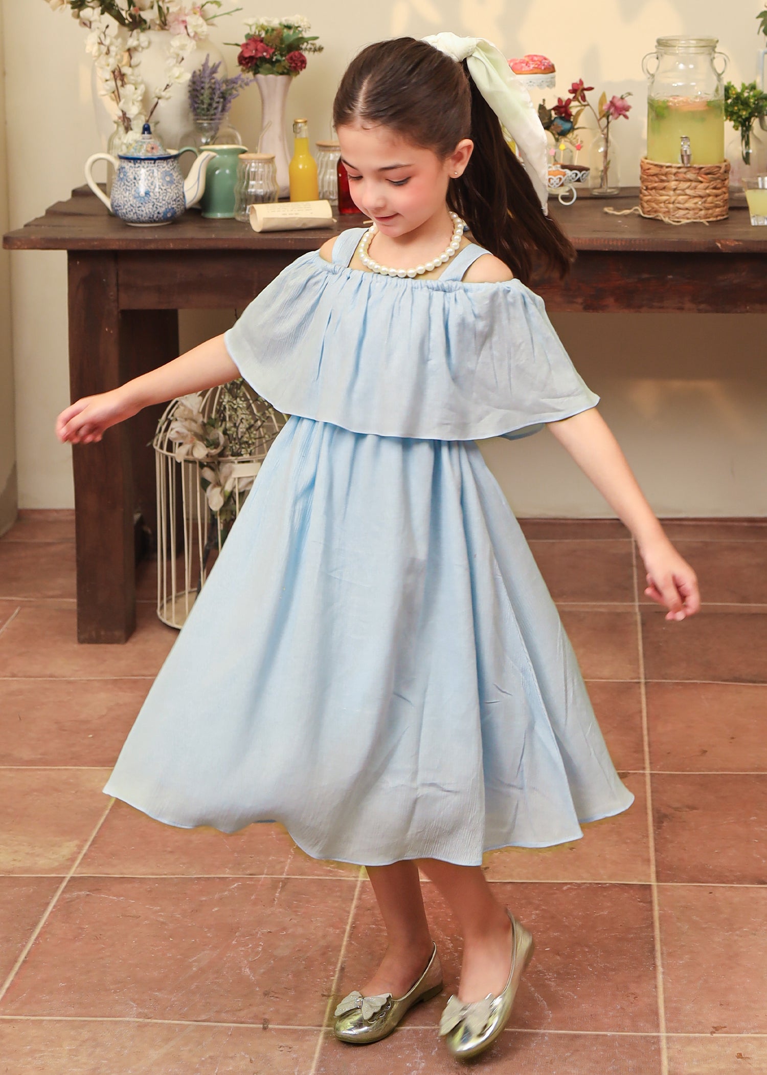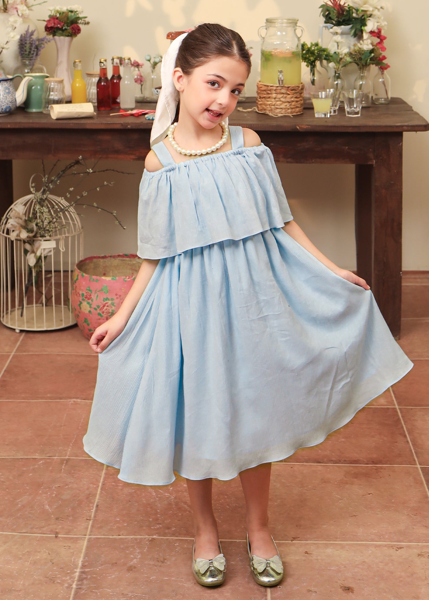 A timeless blend of charm and playfulness— this blue dress features an off shoulder frill dress style with a flowy dress skirt.