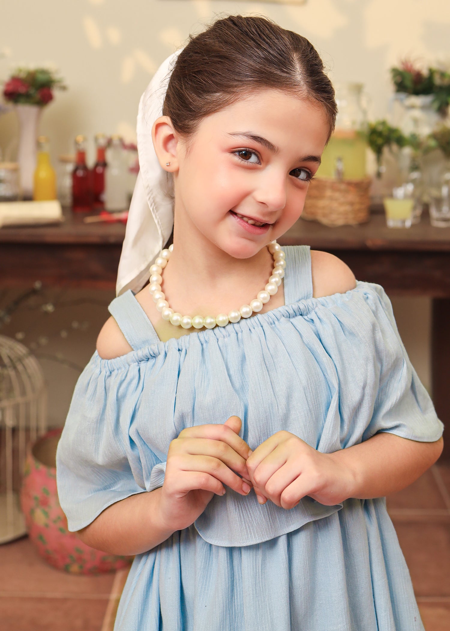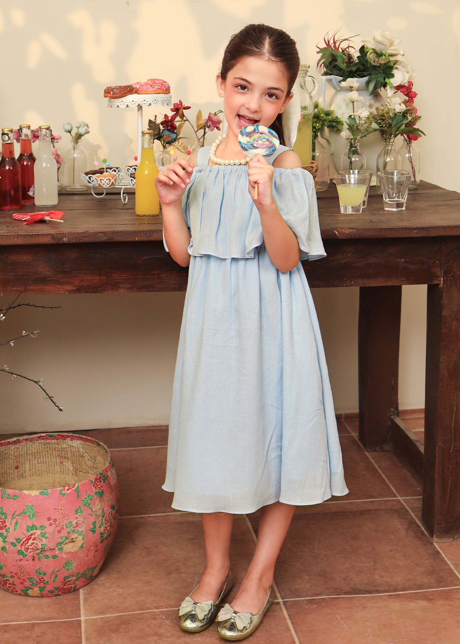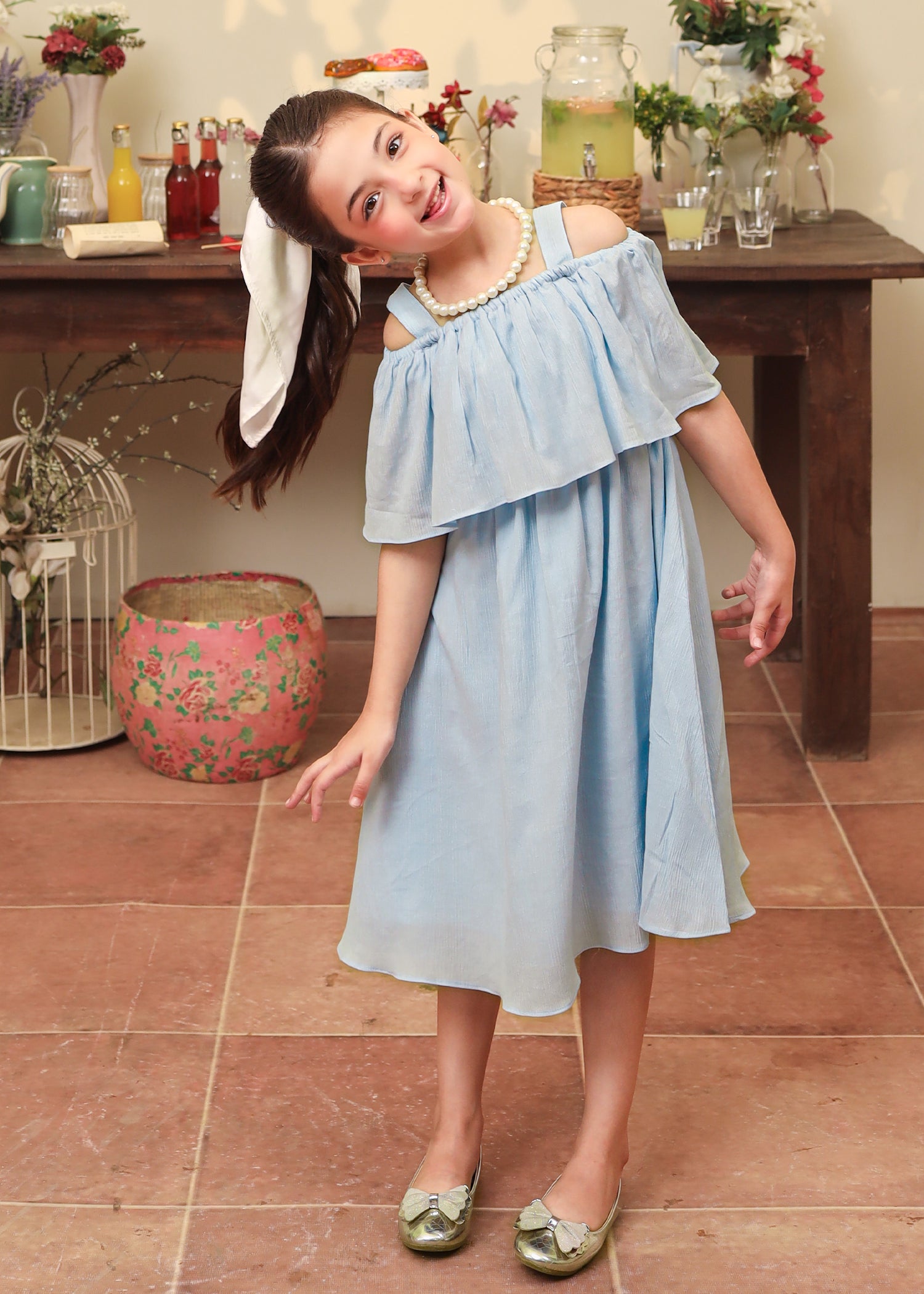 A timeless blend of charm and playfulness— this blue dress features an off shoulder frill dress style with a flowy dress skirt.