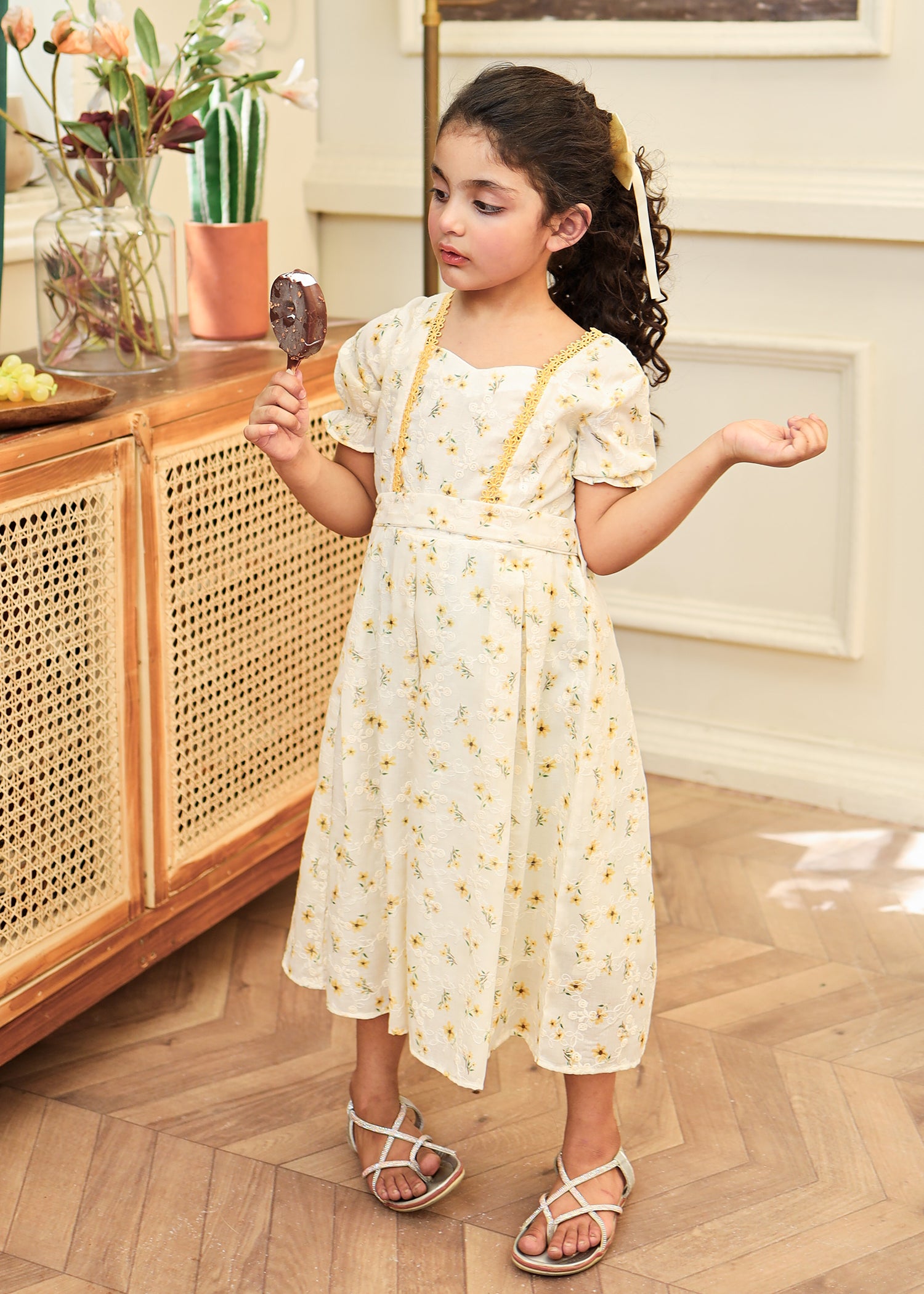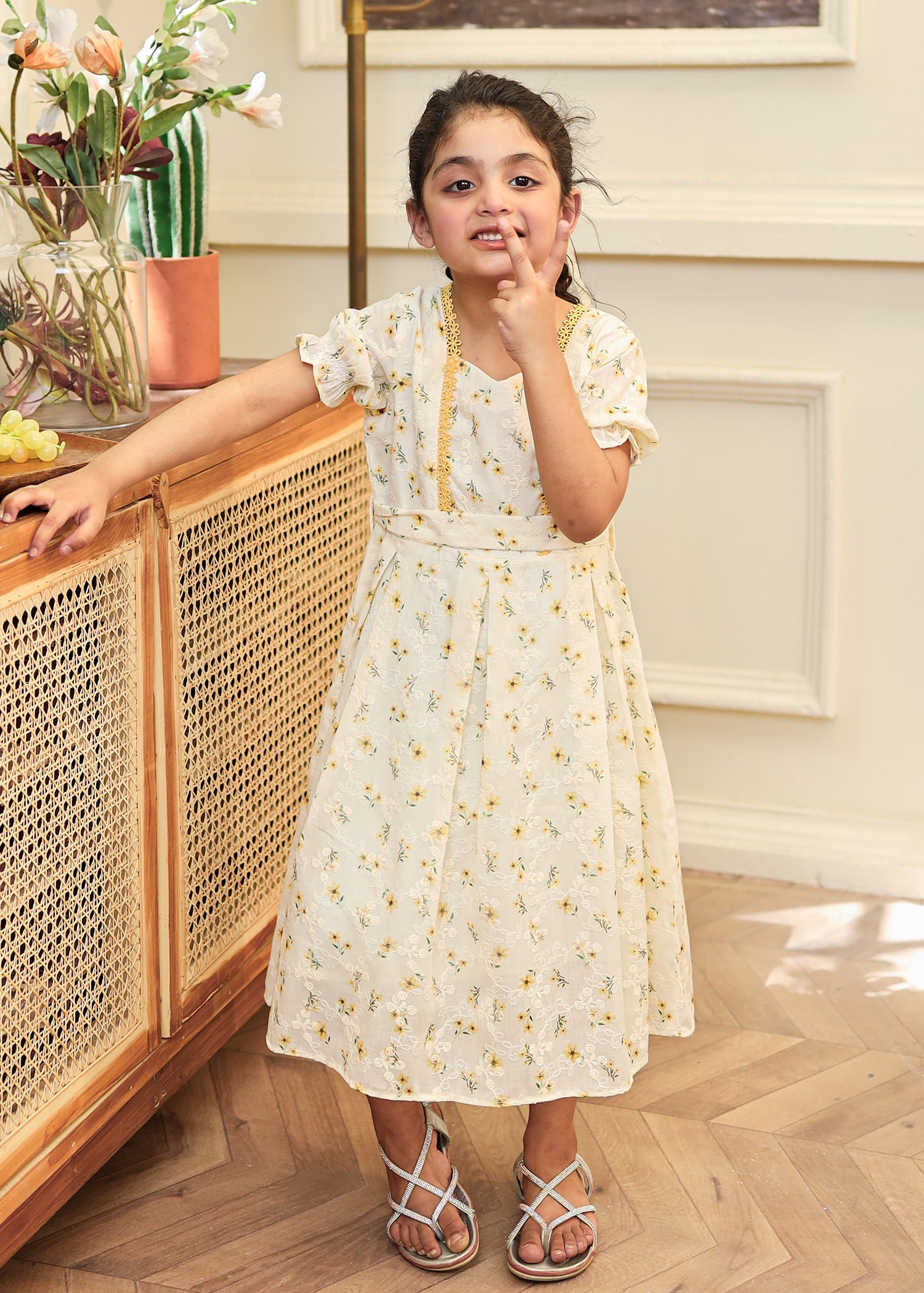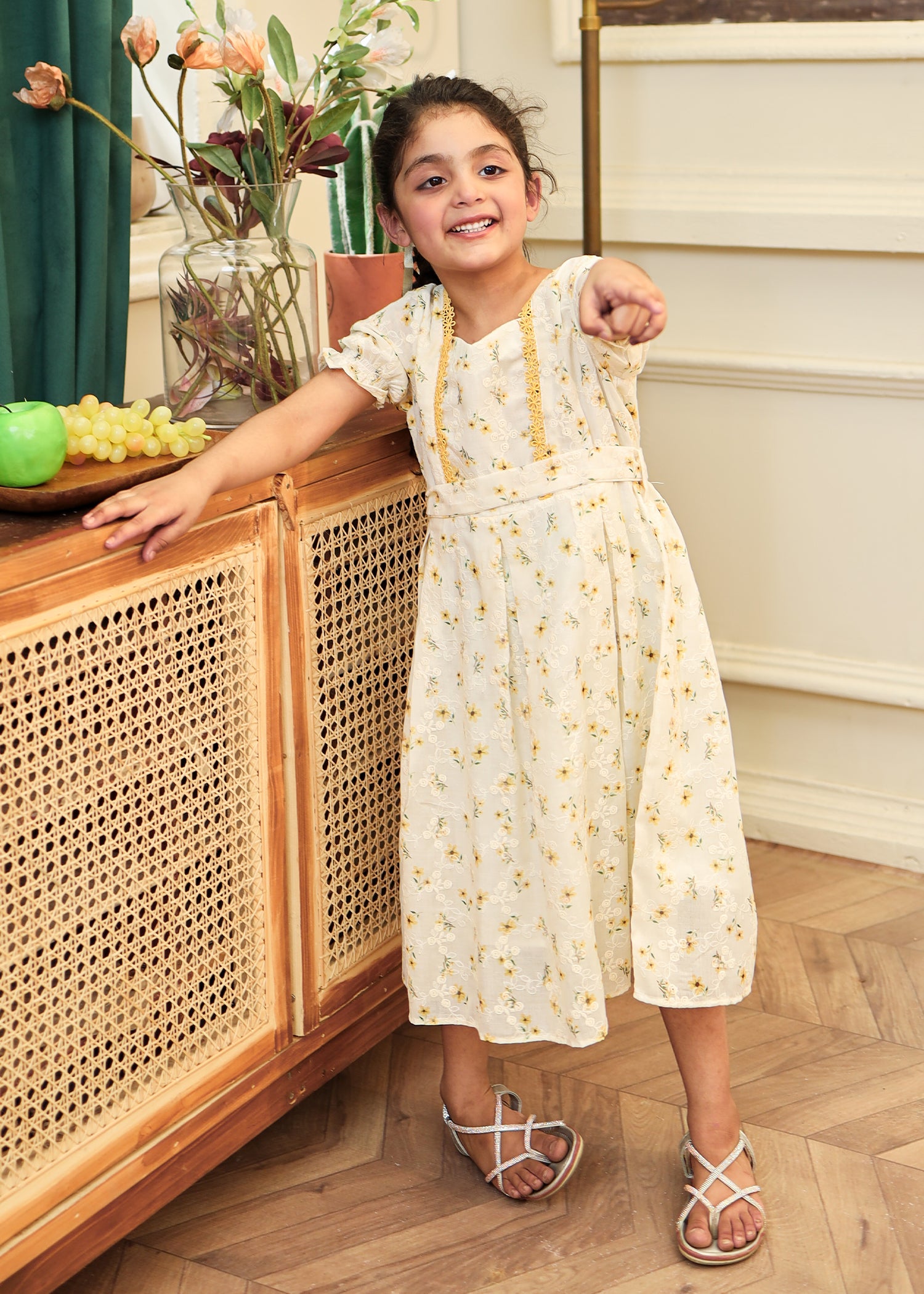 Crafted from flowing zinc eyelet fabric, this dress features a captivating sweetheart neckline with delicate lace details adorning the front and back of the bodice. Enchanting puffy elastic sleeves add a touch of romance, while the skirt flows beautifully till the end.