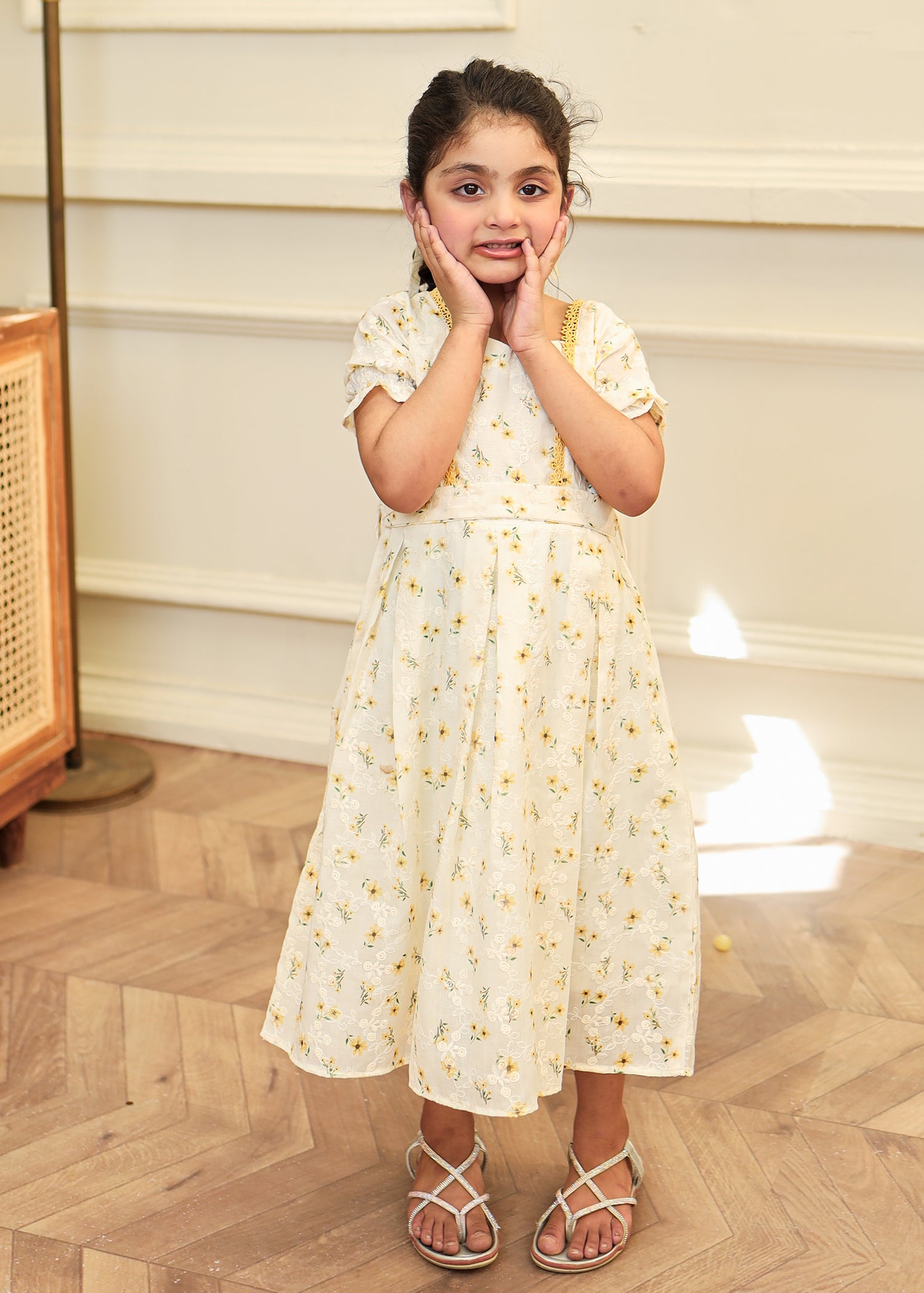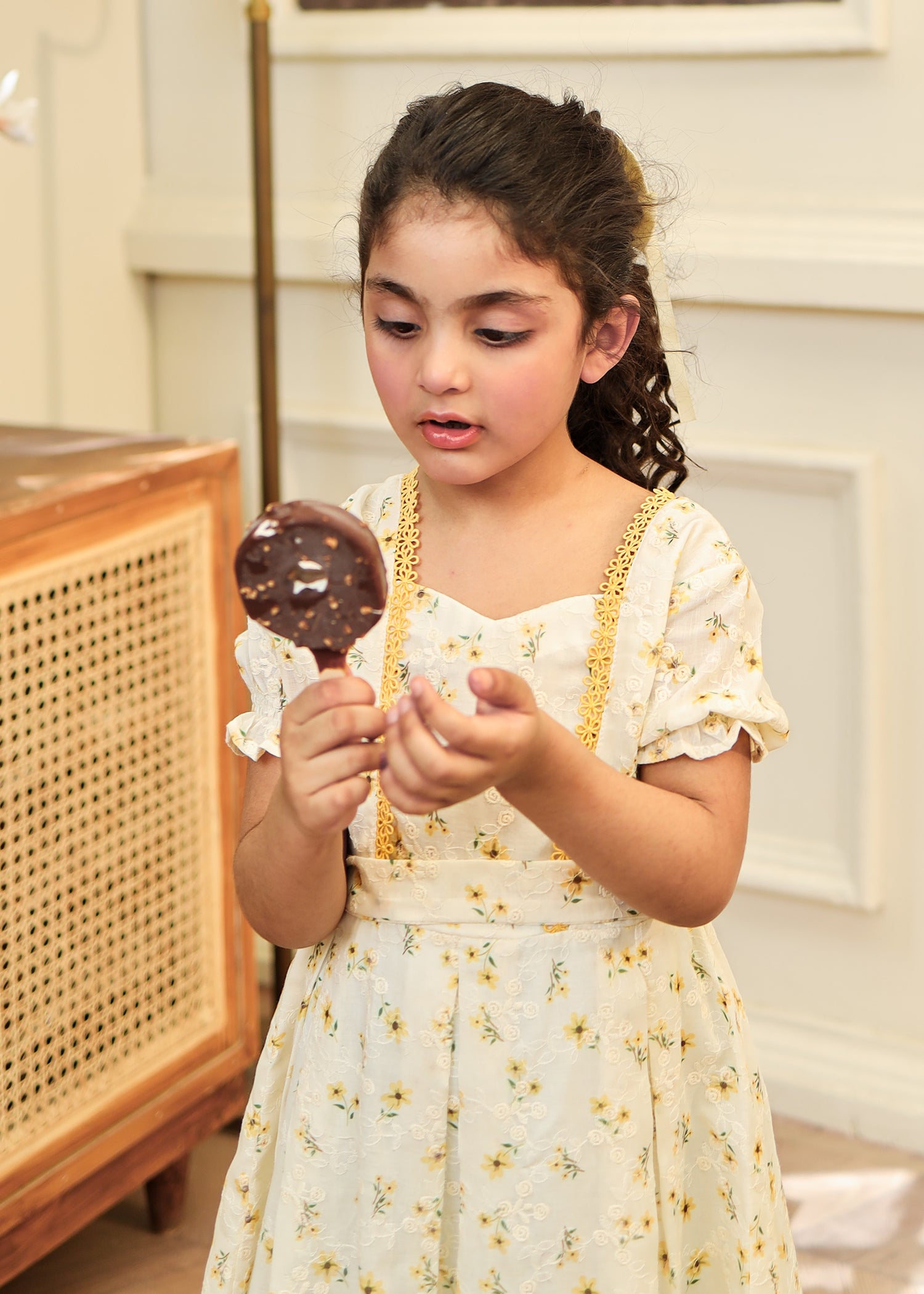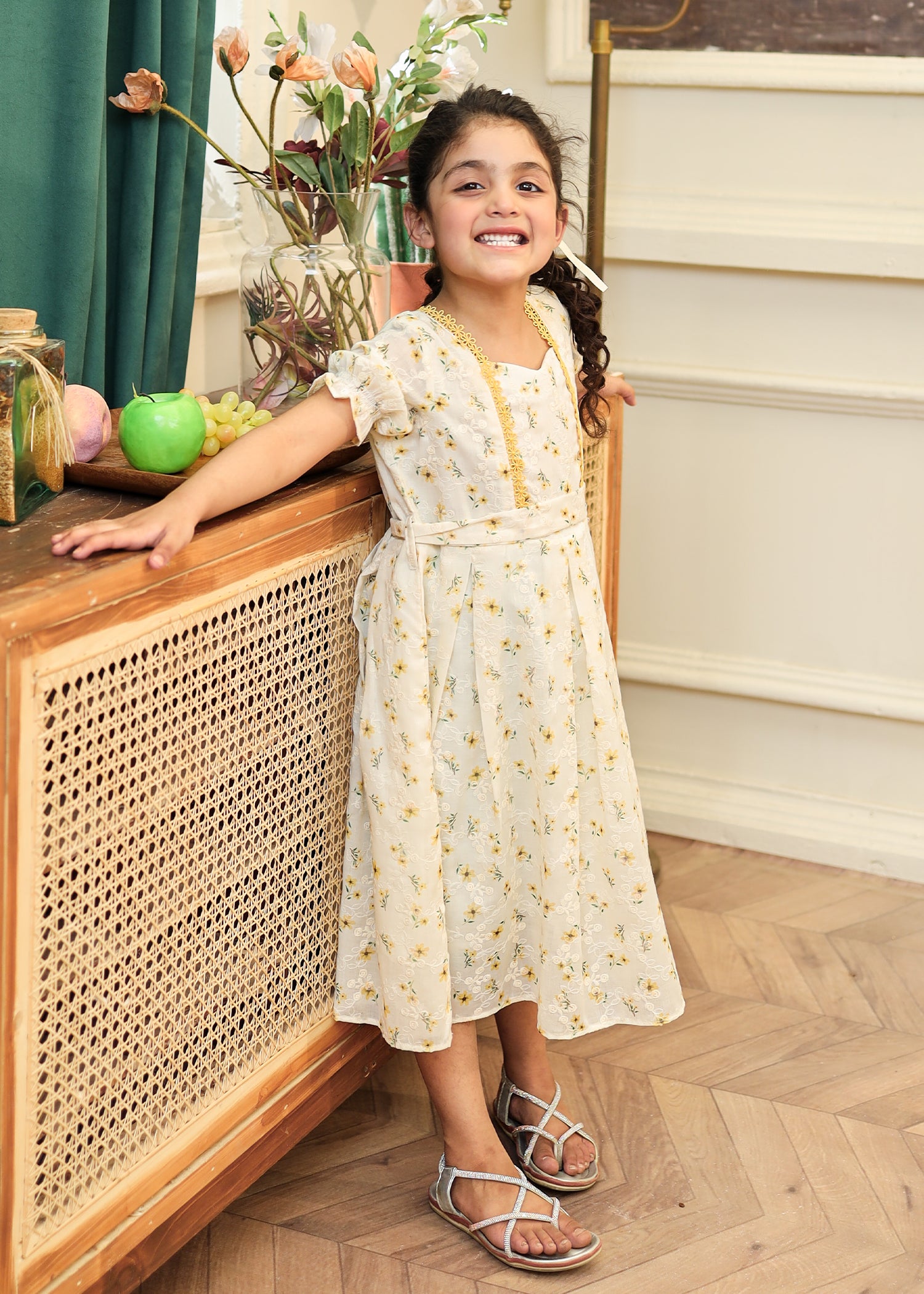 Crafted from flowing zinc eyelet fabric, this dress features a captivating sweetheart neckline with delicate lace details adorning the front and back of the bodice. Enchanting puffy elastic sleeves add a touch of romance, while the skirt flows beautifully till the end.