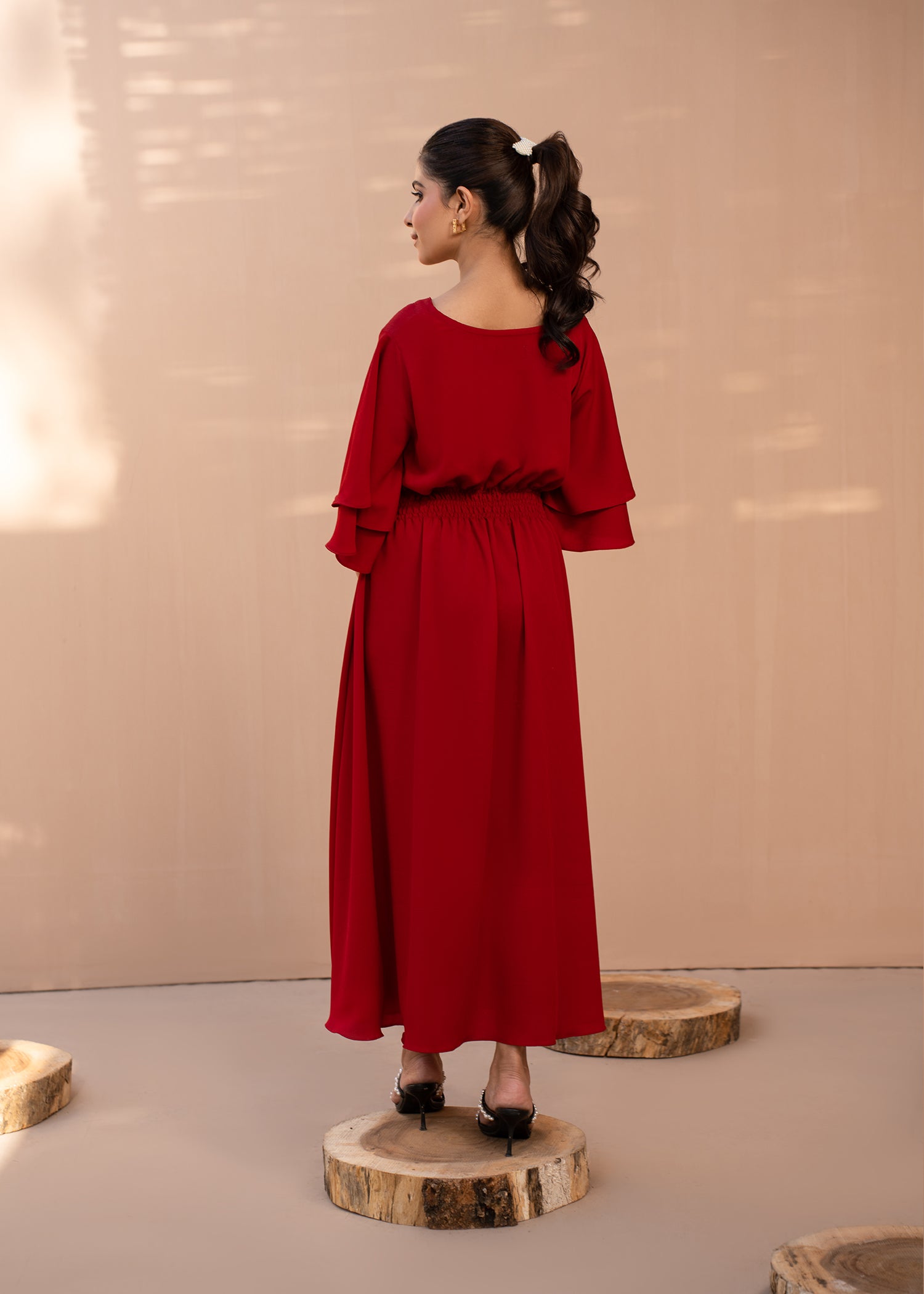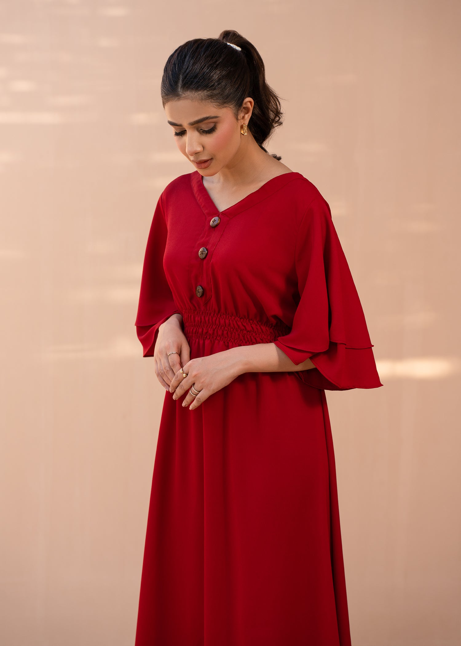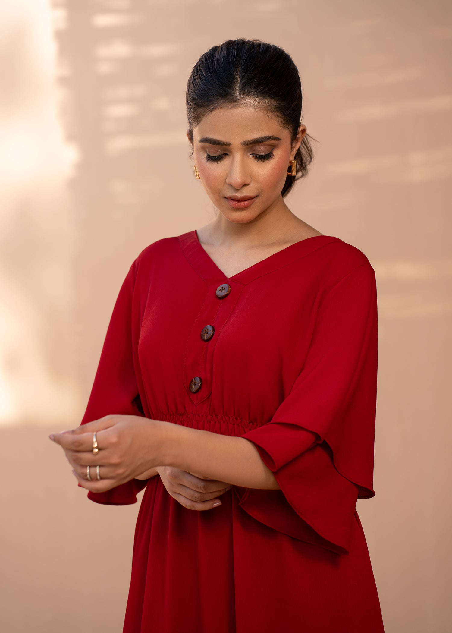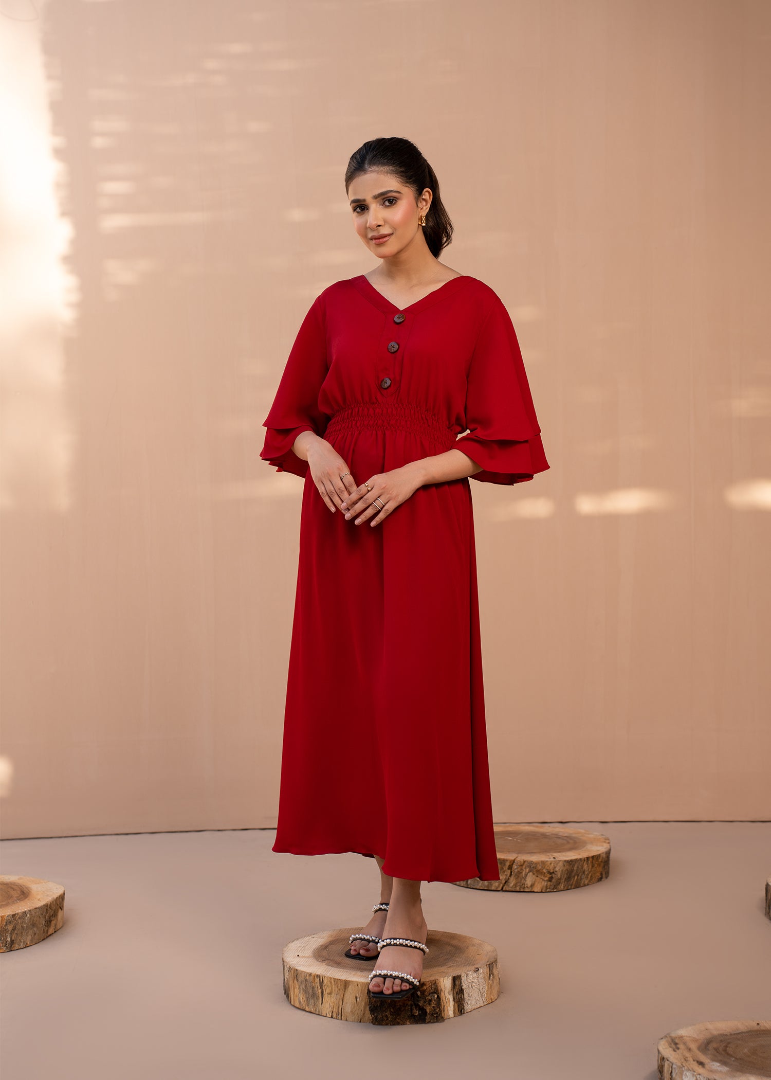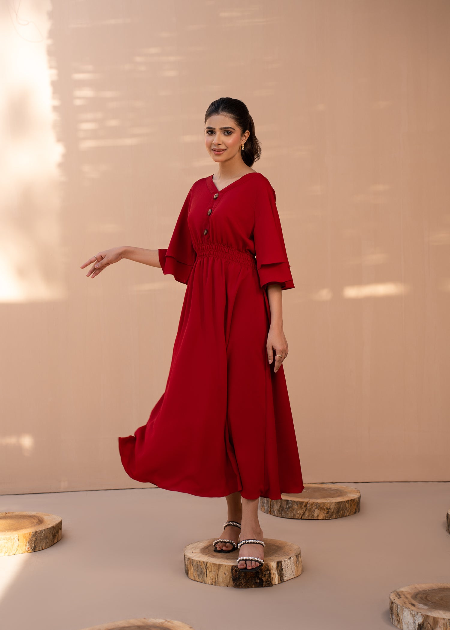 Unveil your inner diva with our Scarlet Dress, a stunning creation that embodies elegance and allure. This red dress, with its striking V-cut neckline and charming button details, is designed to turn heads and capture hearts. The smocked waist effortlessly flatters your figure, while the double frill sleeves add a playful touch of sophistication. Whether you're stepping out for a romantic evening or a chic daytime event, this is your perfect companion. Embrace the power of red and make every moment unforgettable.