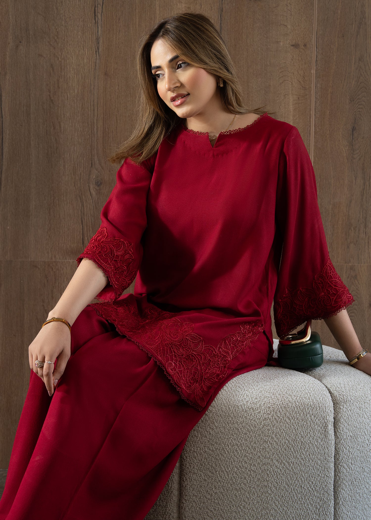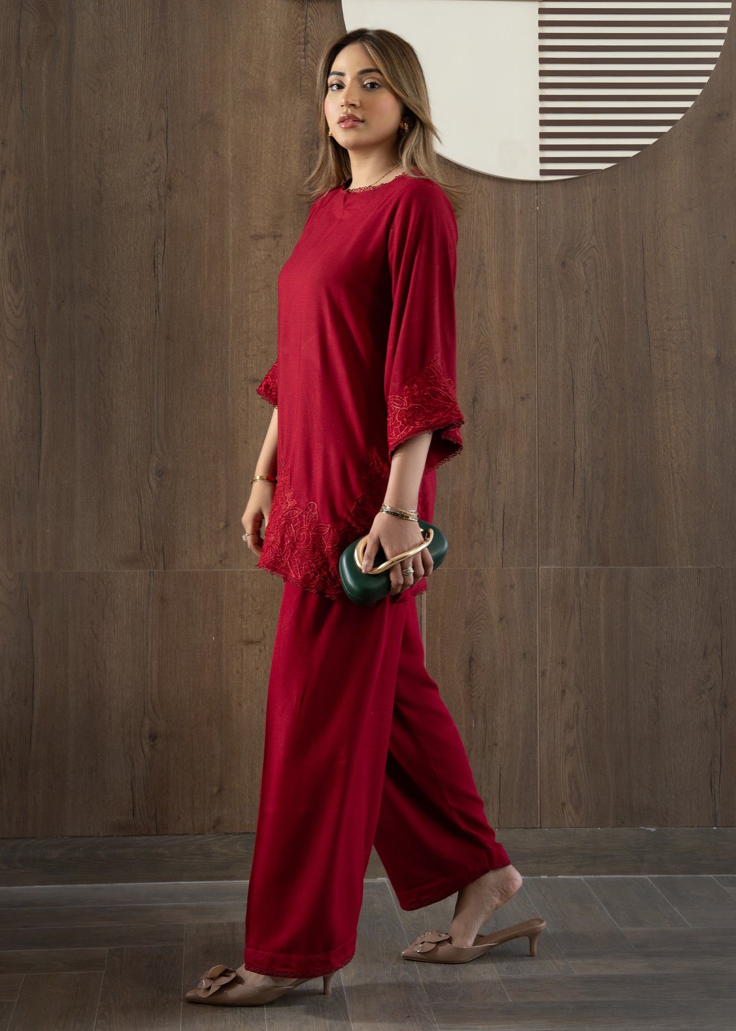 A maroon co-ord set designed for days that start early and end late. The shirt features delicate embroidery along the hem and sleeves, finished with soft lace detailing at the neckline. Paired with relaxed farshi shalwar, it’s an easy festive look that feels dressed up without feeling heavy.