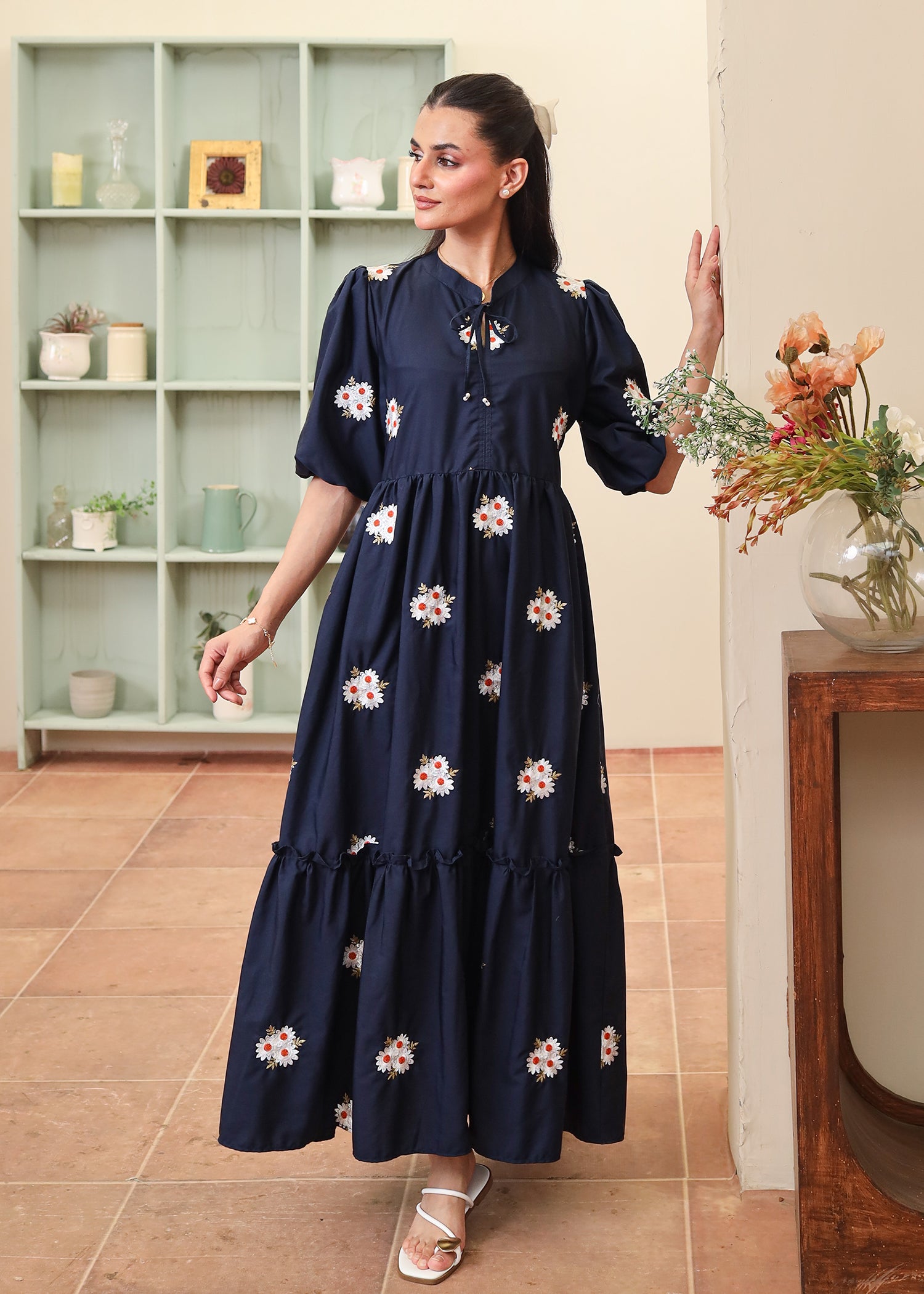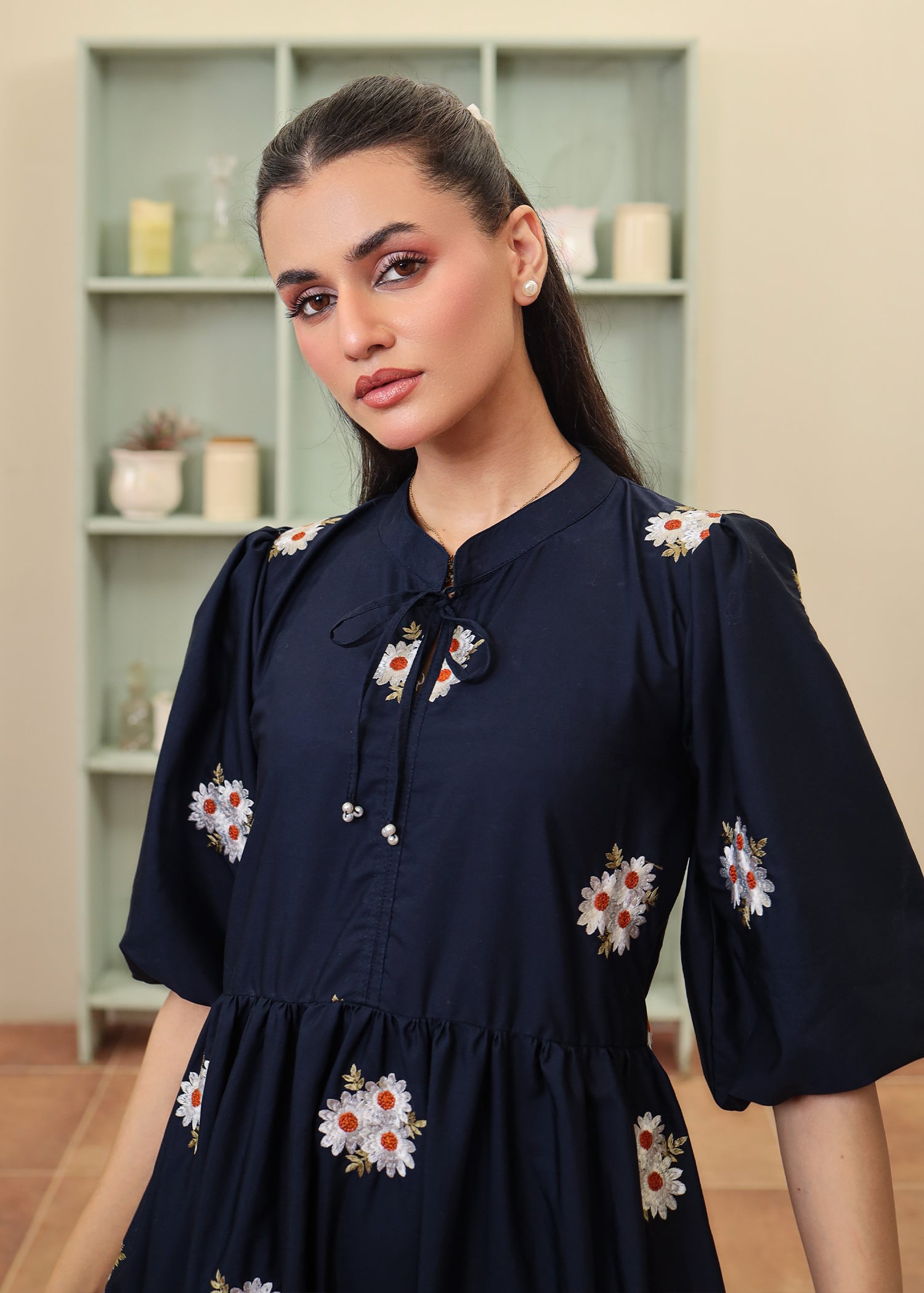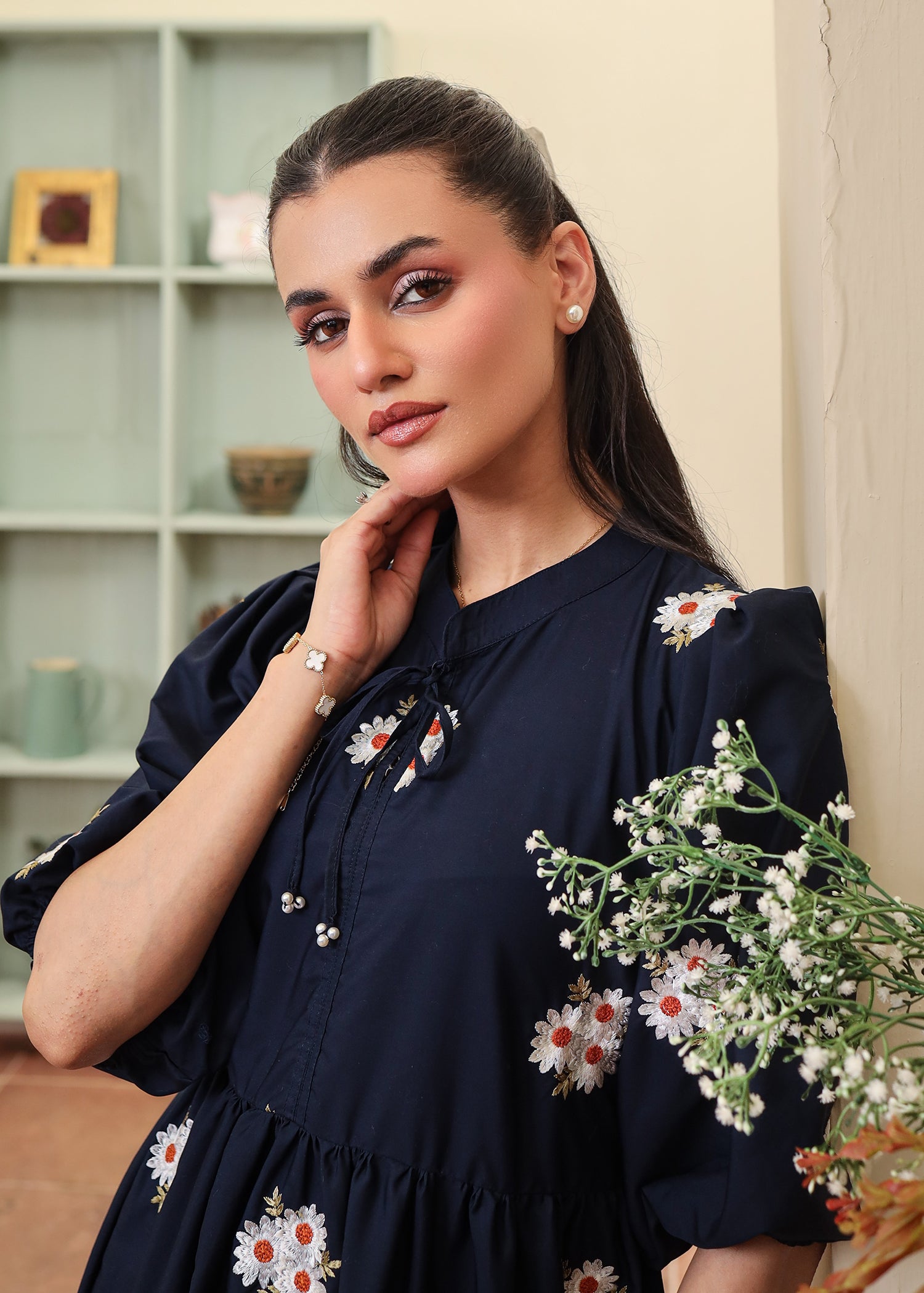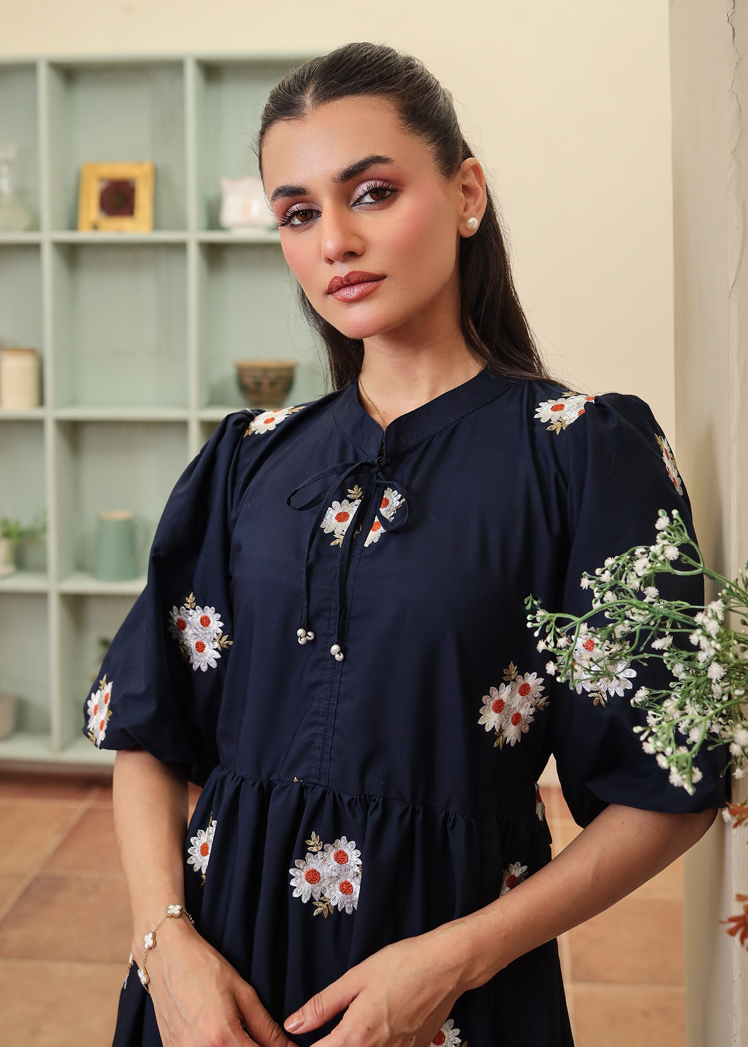 This embroidered cotton dress is everything that you need this spring! Selena features a V-ban neckline with a tie embellished with pearls, puffy elastic sleeves and a bottom frill.