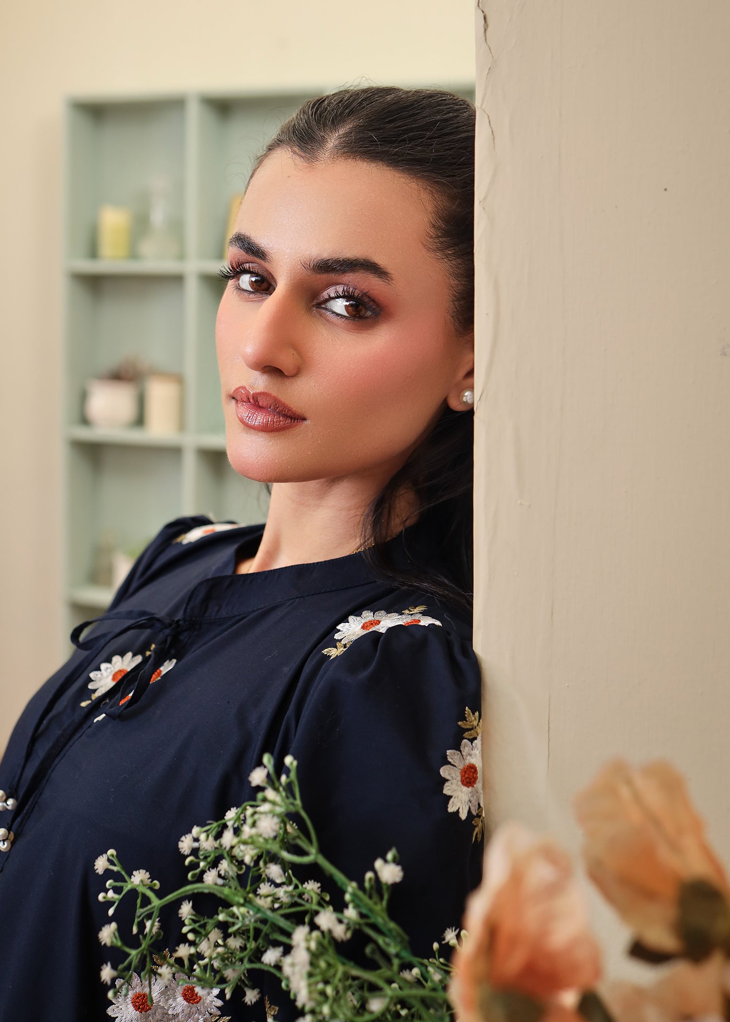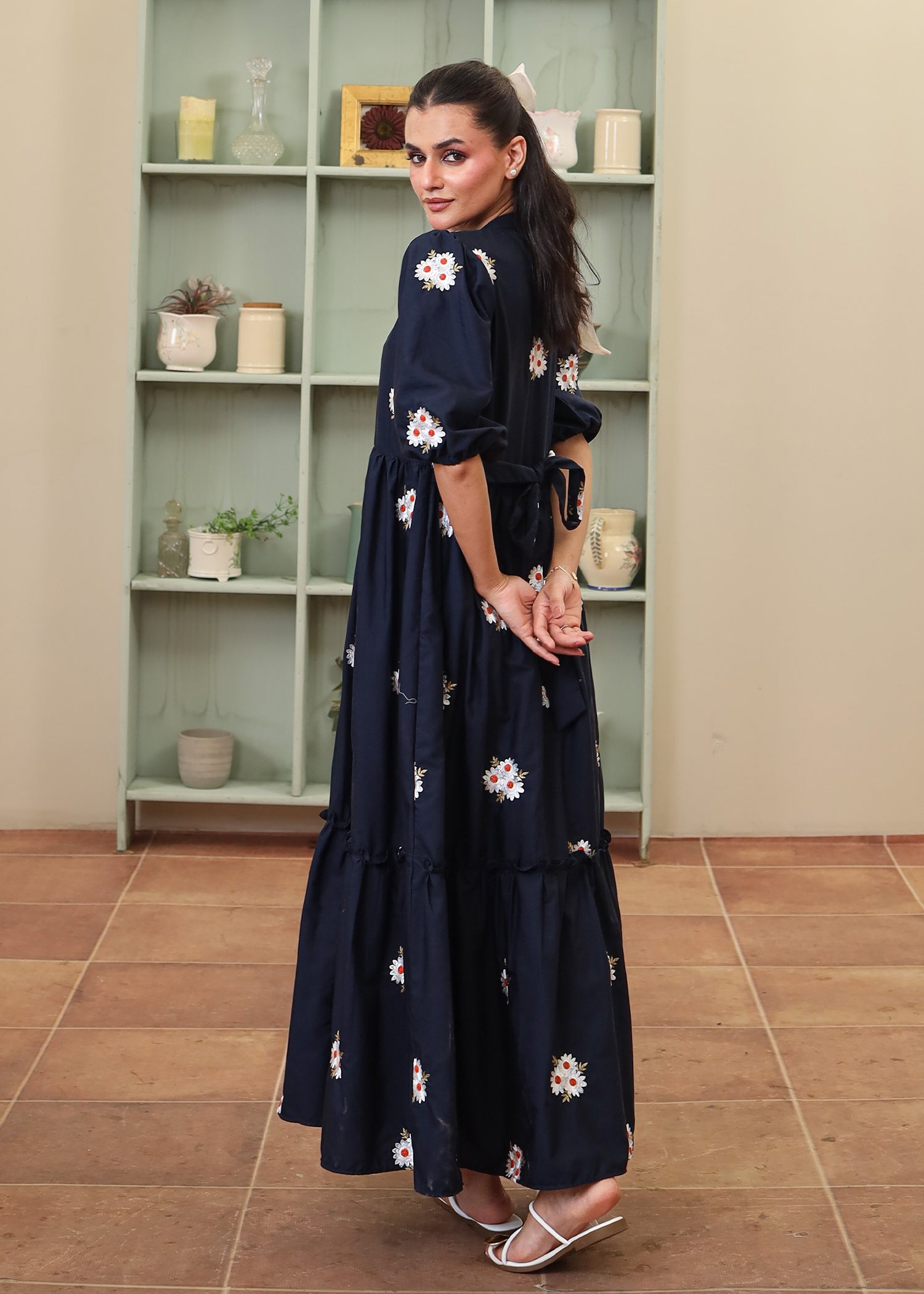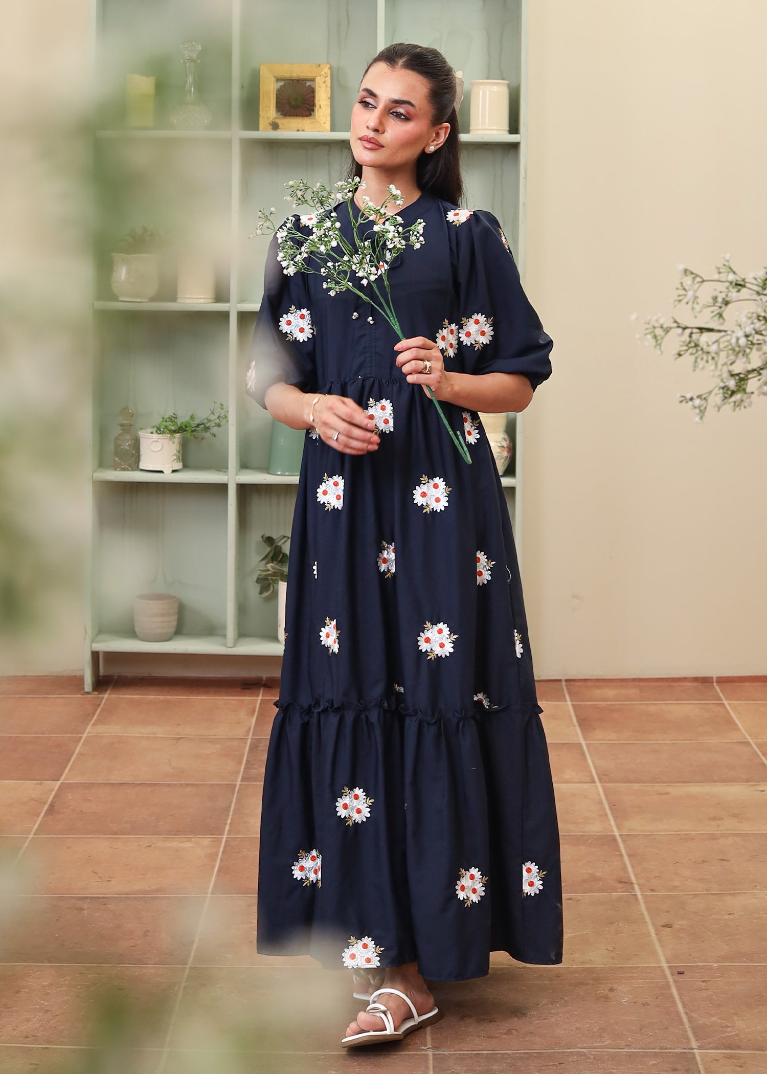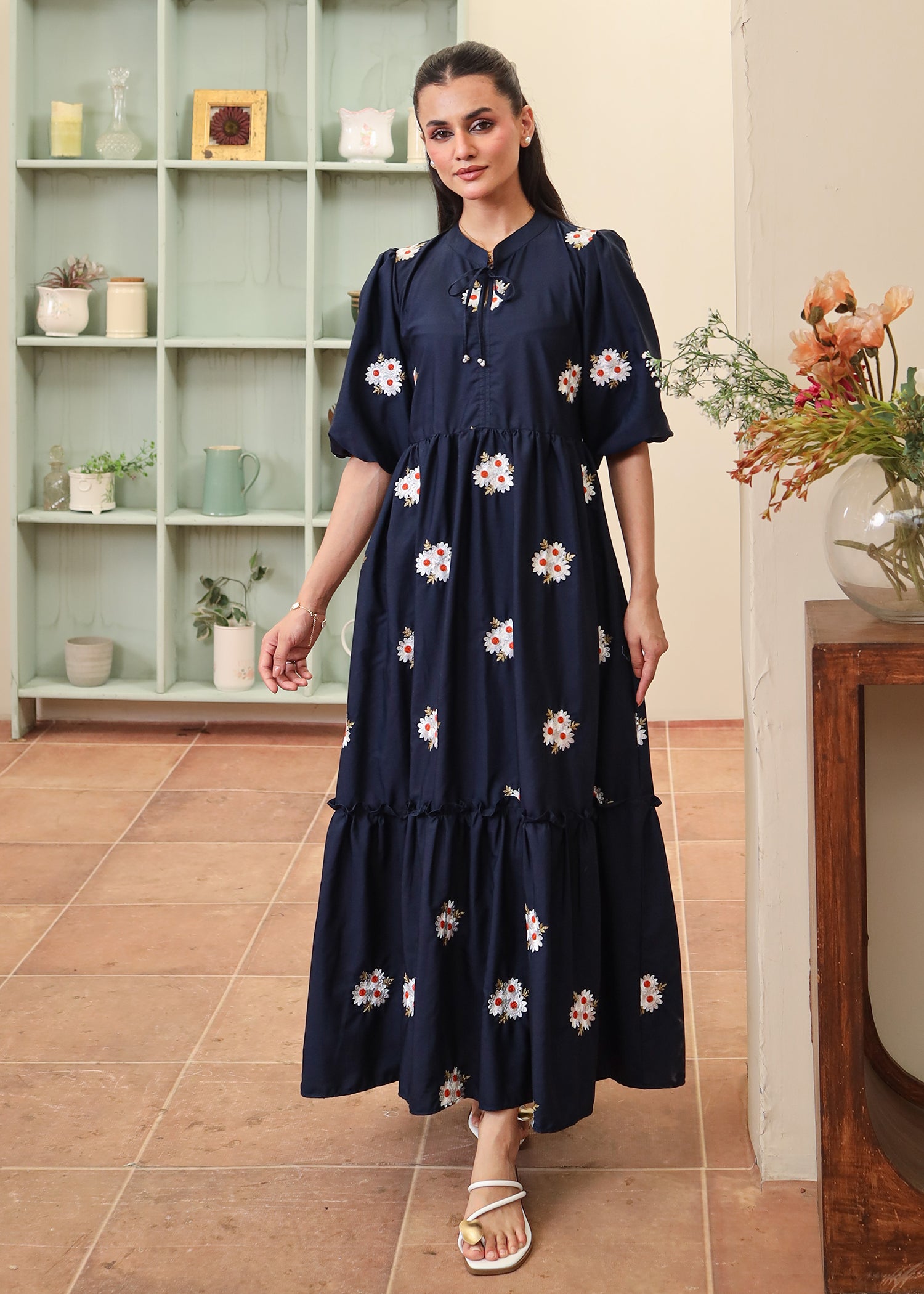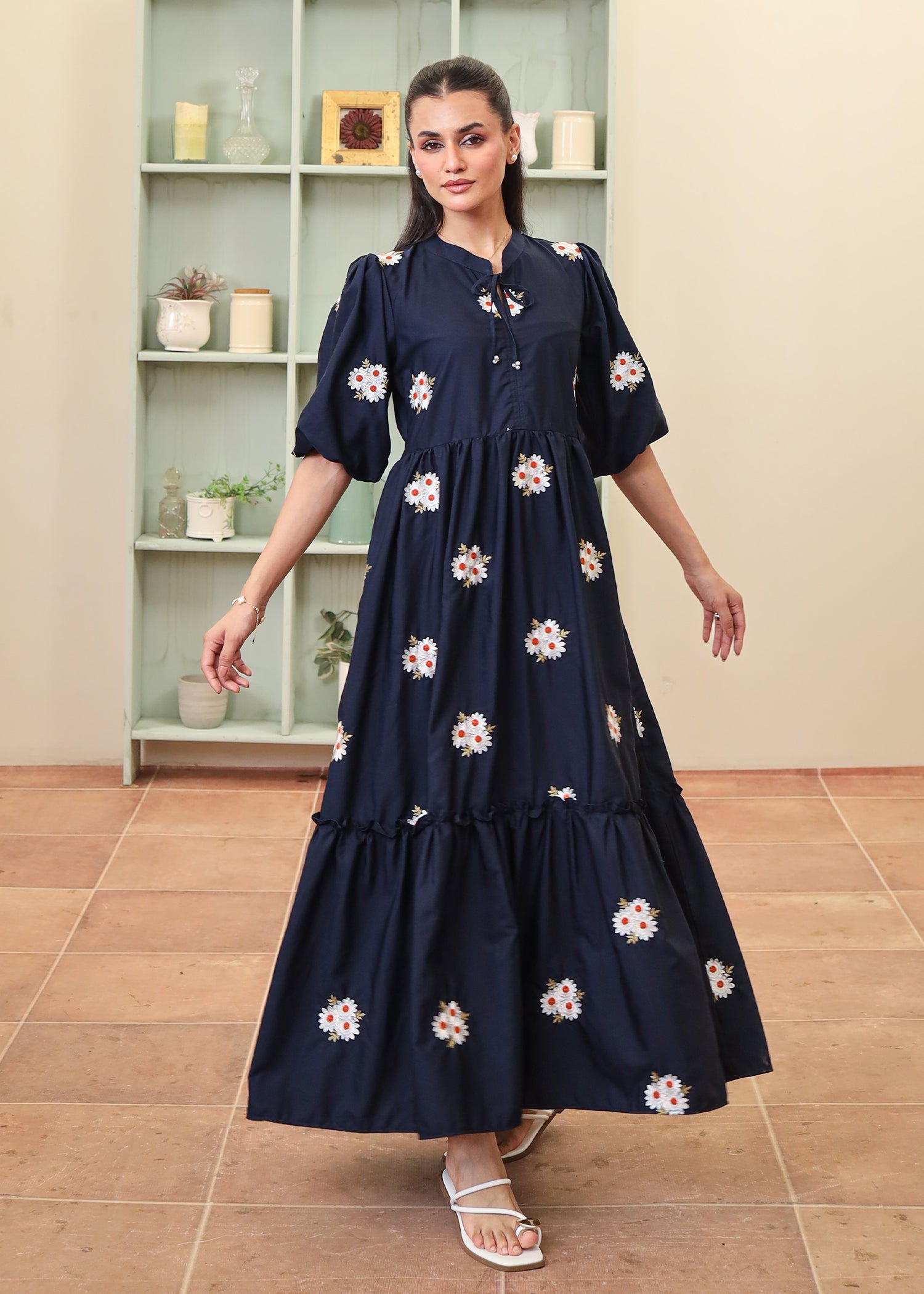 This embroidered cotton dress is everything that you need this spring! Selena features a V-ban neckline with a tie embellished with pearls, puffy elastic sleeves and a bottom frill.
