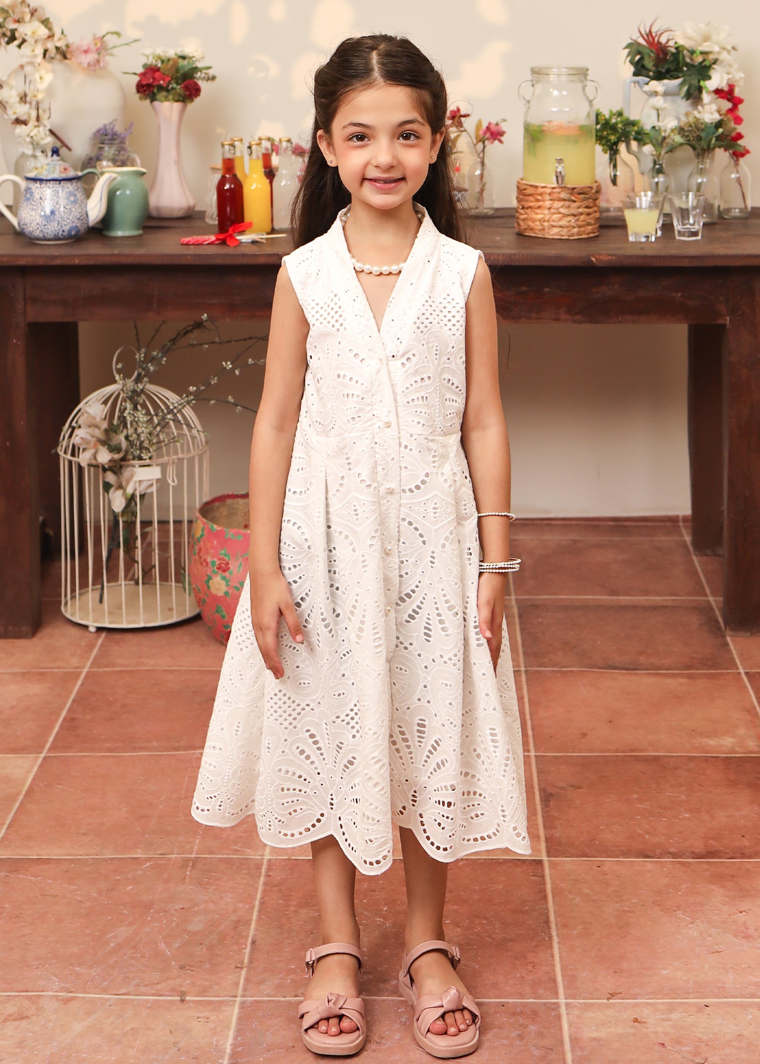 Fabric of the dress is eyelet (chikankari) with an attached lining.