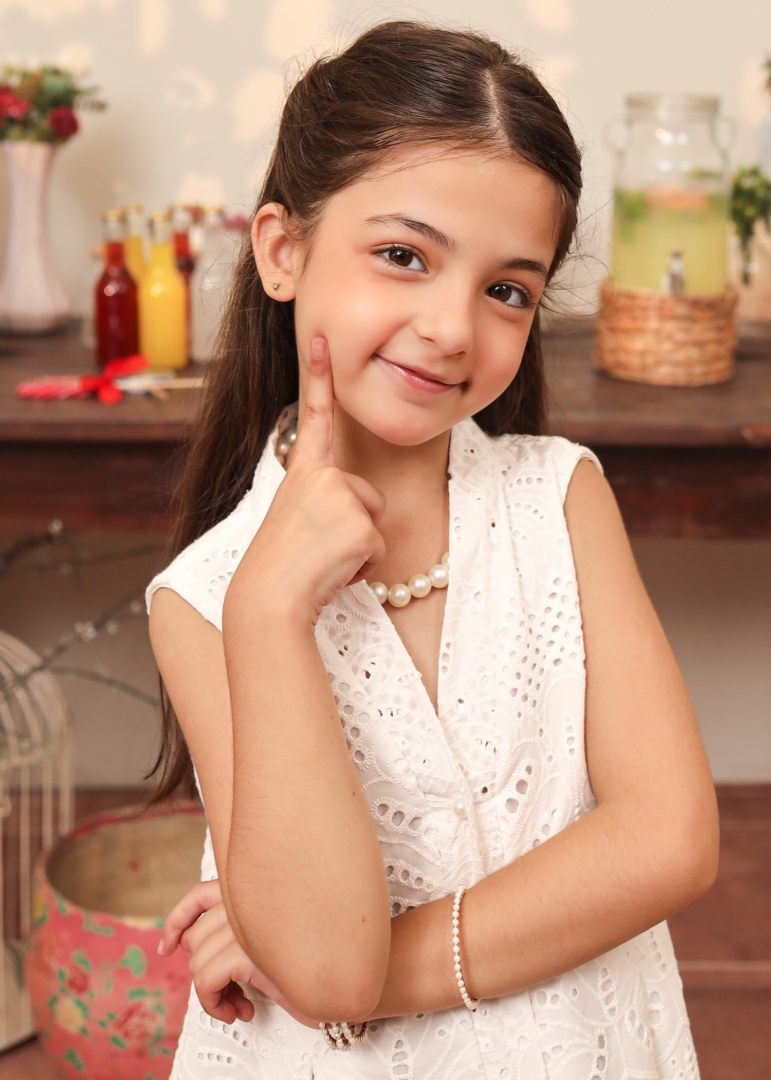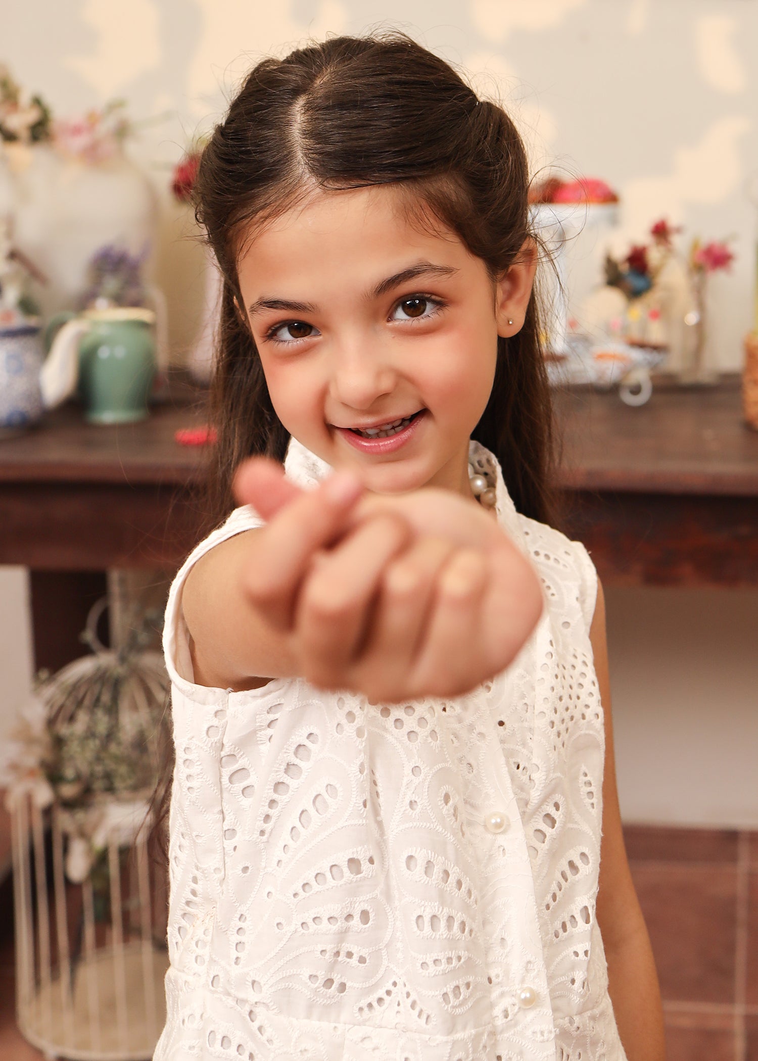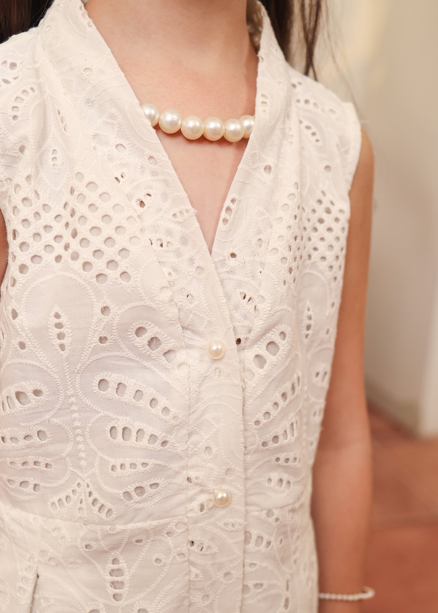 A timeless blend of charm and grace — this white eyelet dress features a flattering V-cut neckline, a chic button-down front that opens into a subtle slit, and elegant puffy elbow-length sleeves. Designed to move with you, it’s the perfect piece for effortless summer days.