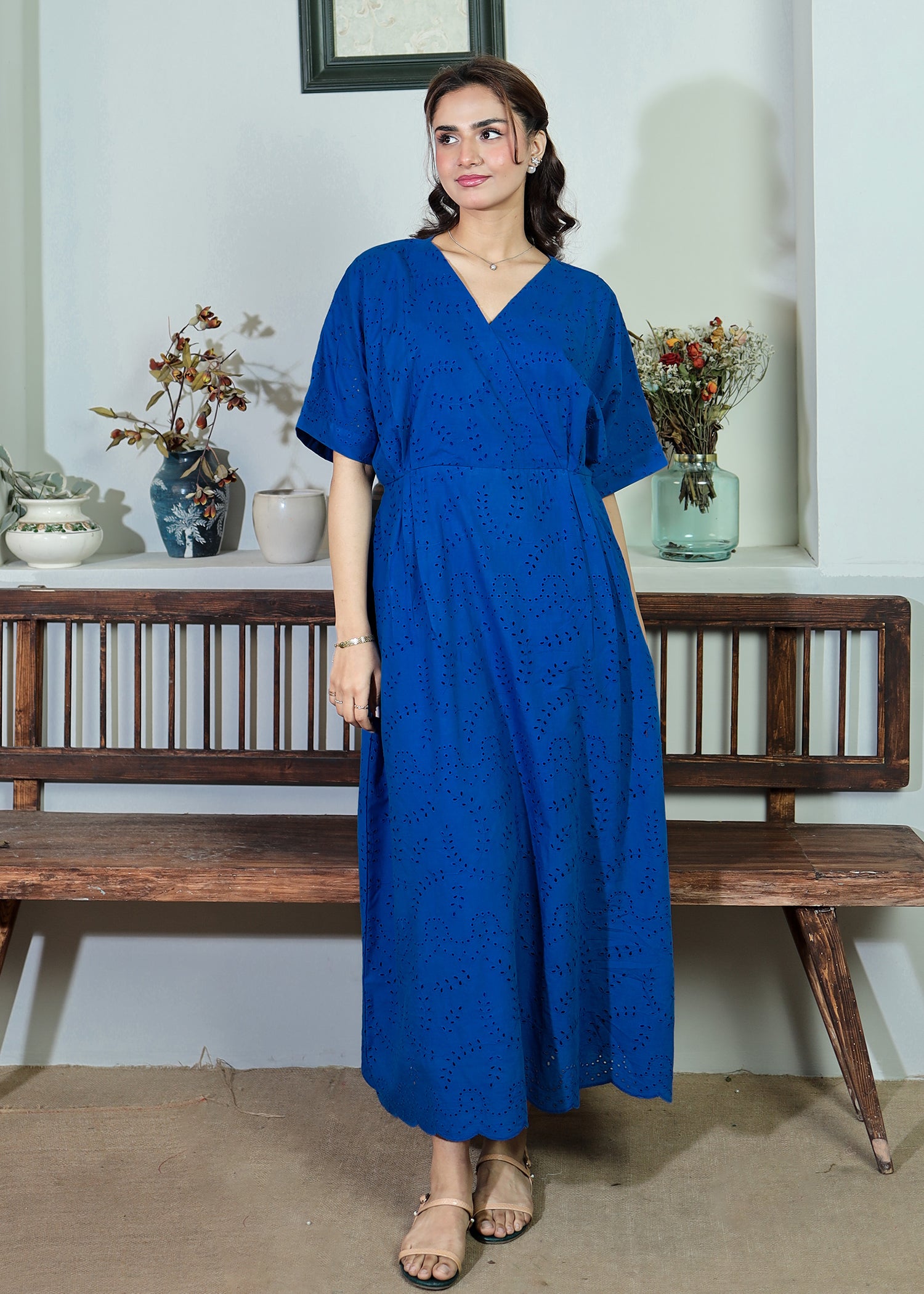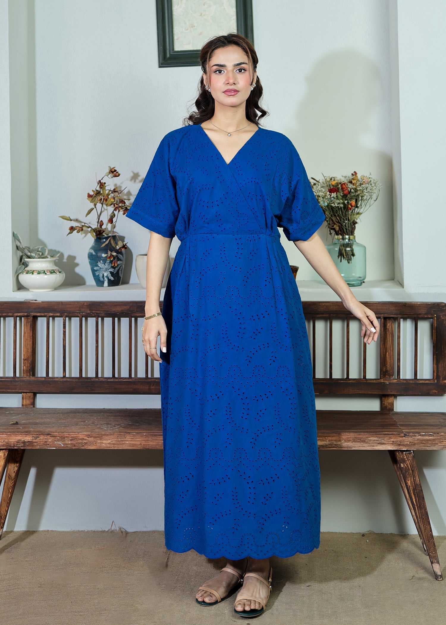 Experience refined elegance with our Sophie Dress. Crafted from intricate ink blue eyelet fabric, this dress features a sophisticated baggy style wrap neckline that seamlessly flows into the bodice. Both the bodice and the skirt are adorned with meticulous pleating, enhancing the dress's graceful silhouette.