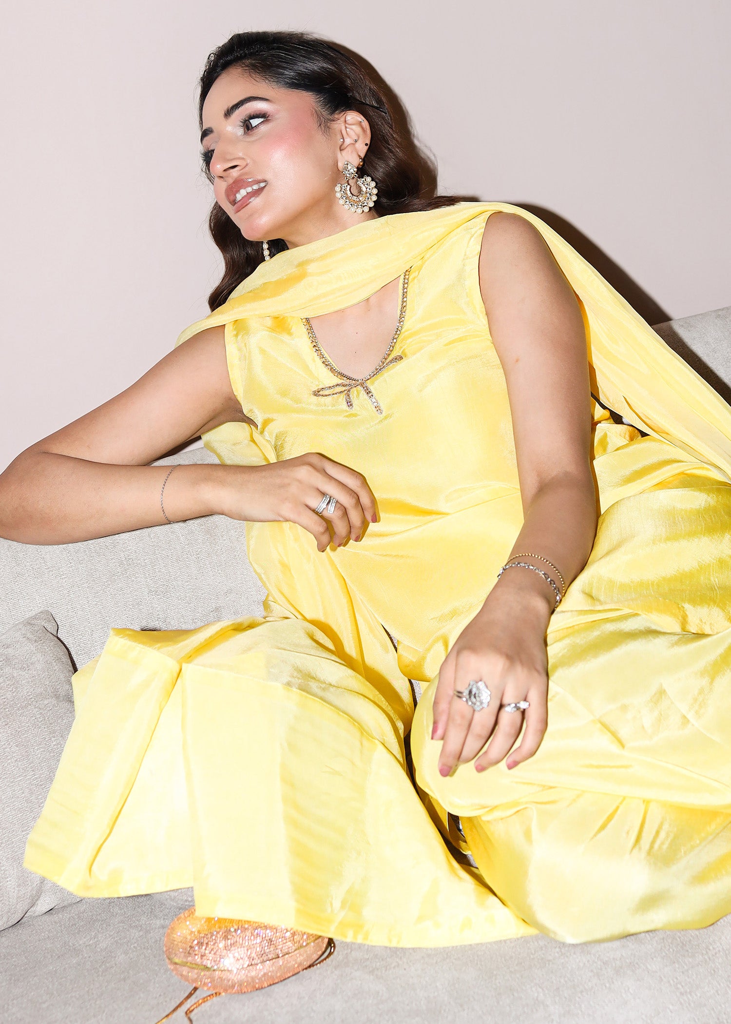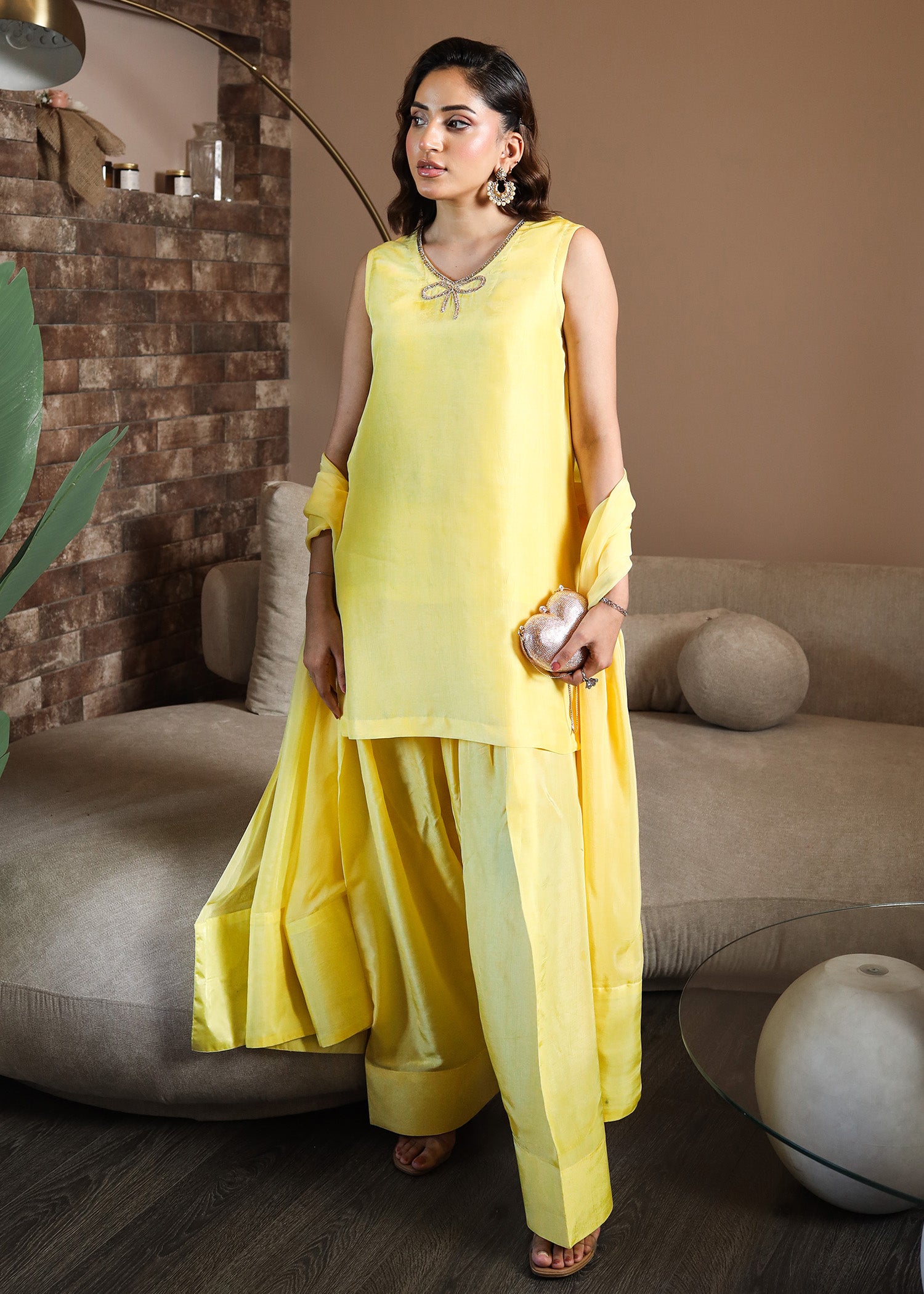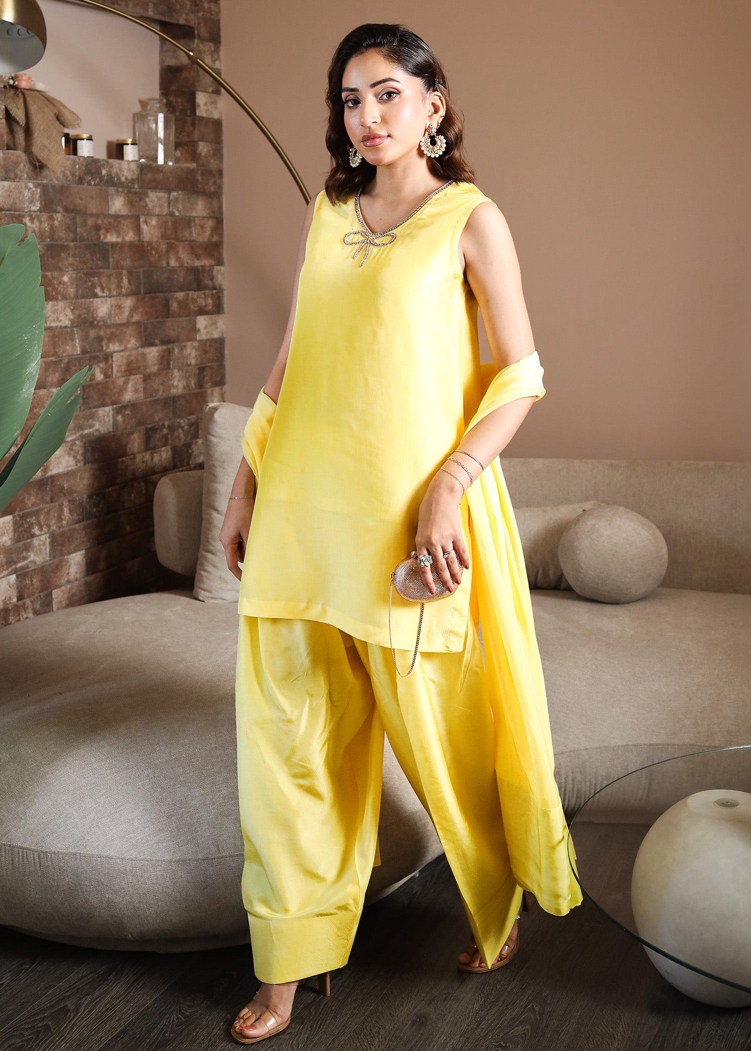 A vibrant semi-formal ensemble in a radiant lemon-yellow hue, Sunlit Glow is designed to bring warmth and joy to every occasion. The minimalist shirt with delicate neckline detailing pairs gracefully with a farshi shalwar and a flowing dupatta, creating a look that is both chic and comfortable. Perfect for daytime festivities, brunches, or summer soirées — this piece embodies the essence of modern elegance with a touch of sunshine.