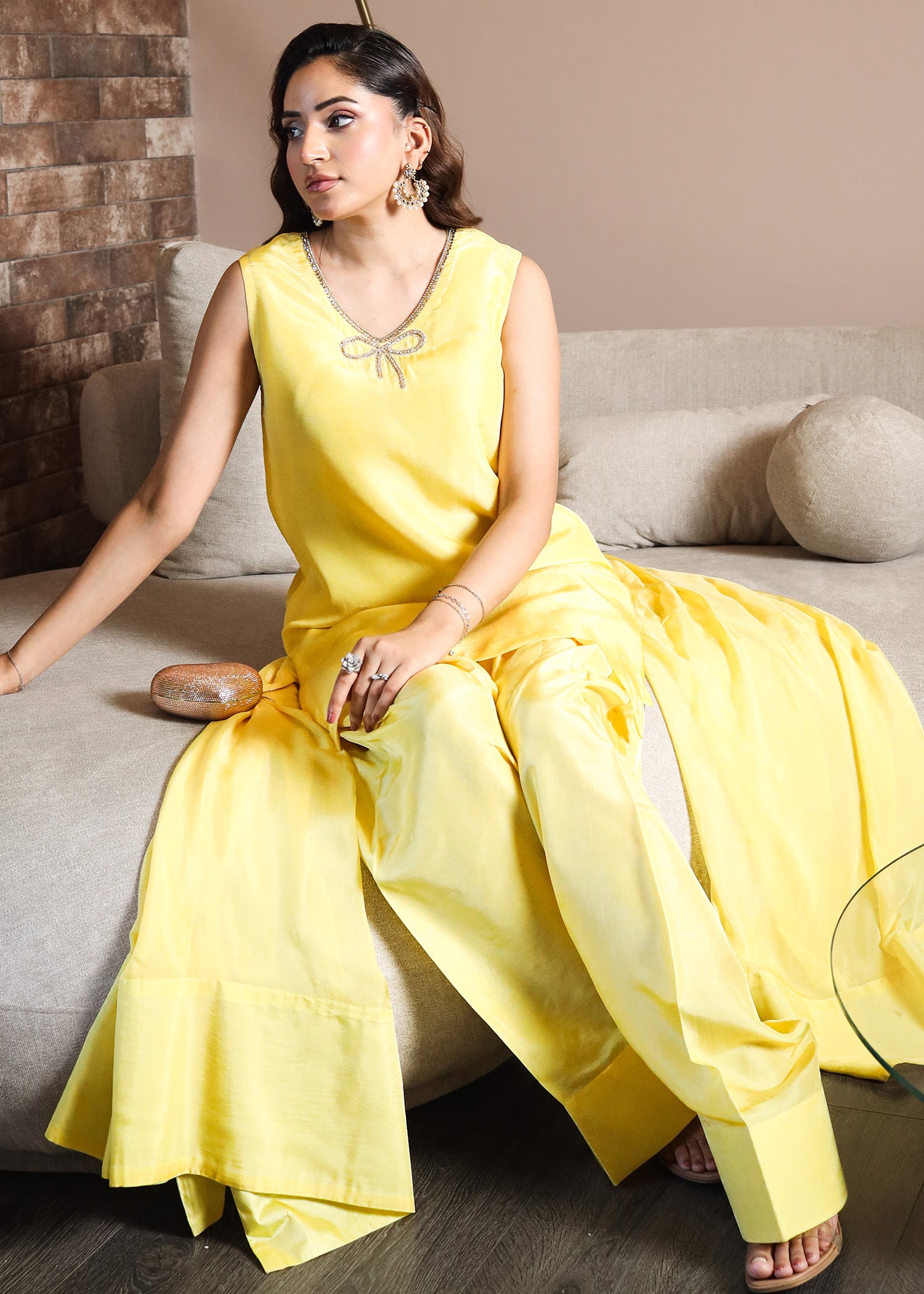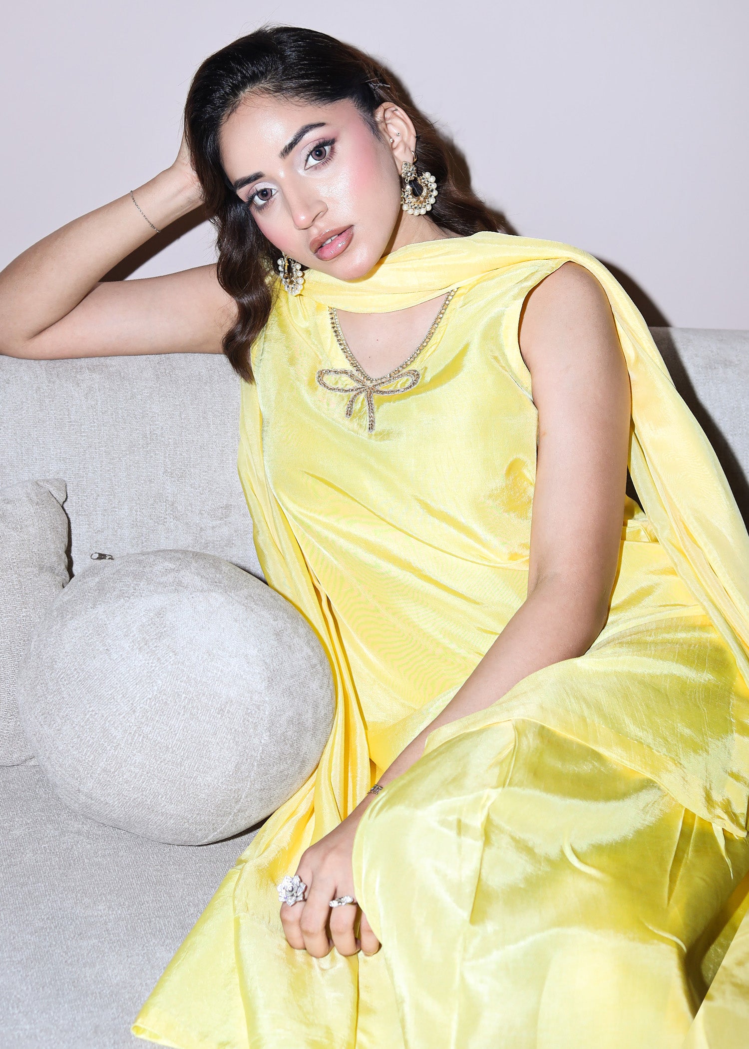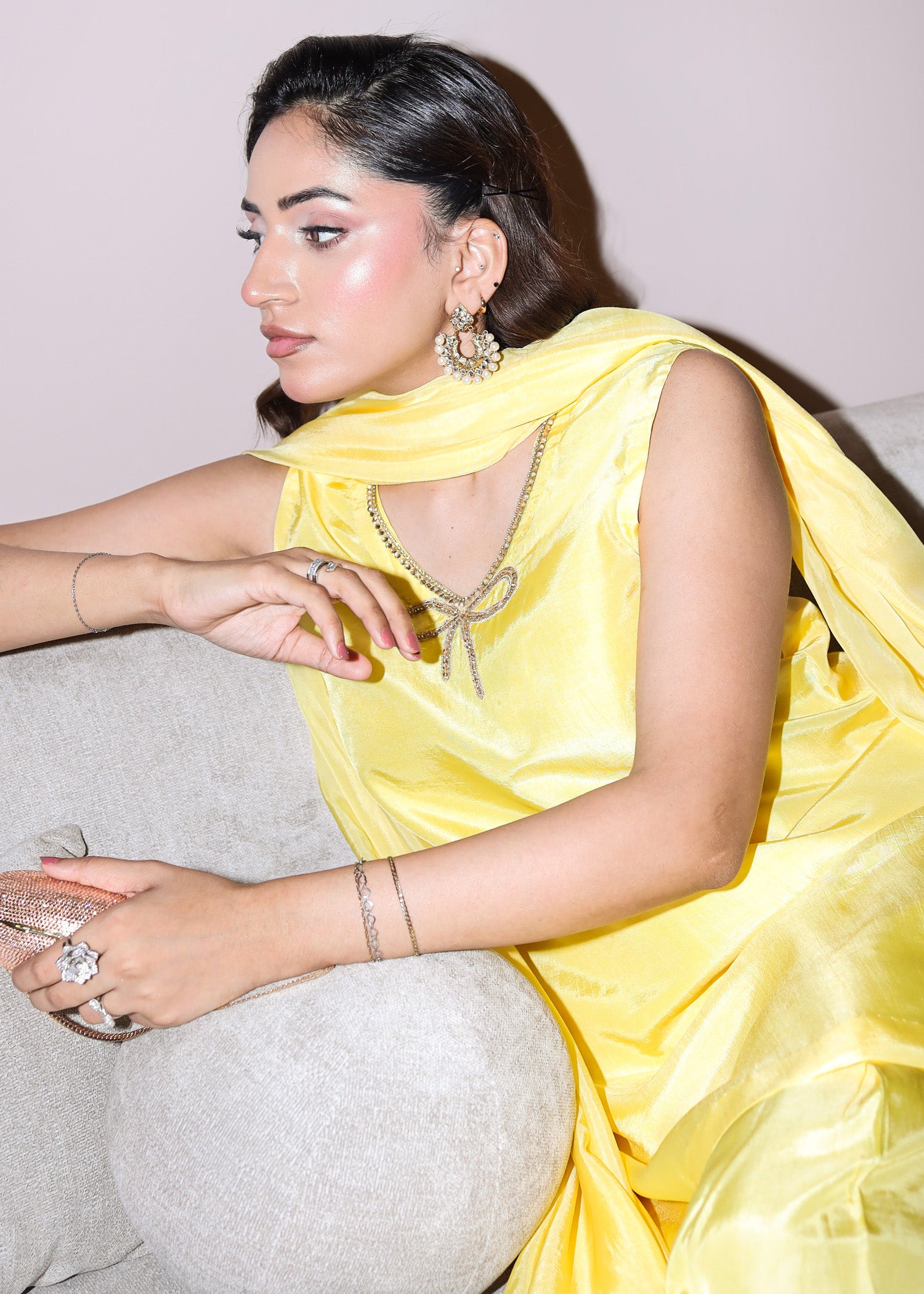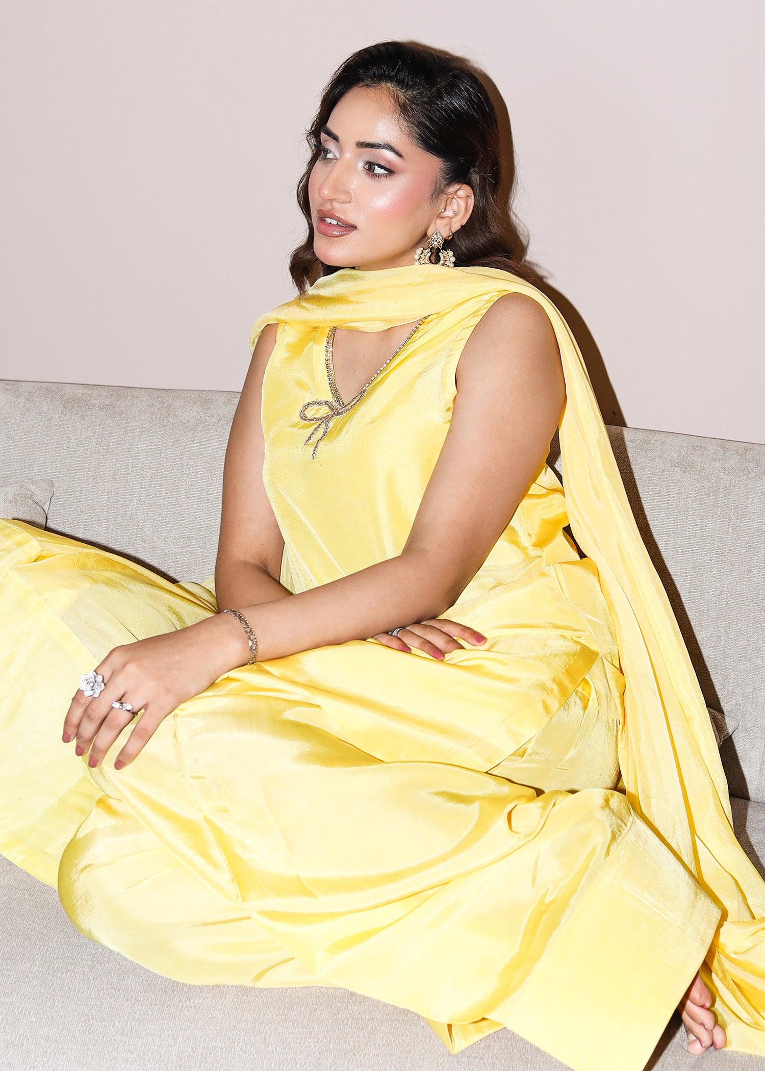 A vibrant semi-formal ensemble in a radiant lemon-yellow hue, Sunlit Glow is designed to bring warmth and joy to every occasion. The minimalist shirt with delicate neckline detailing pairs gracefully with a farshi shalwar and a flowing dupatta, creating a look that is both chic and comfortable. Perfect for daytime festivities, brunches, or summer soirées — this piece embodies the essence of modern elegance with a touch of sunshine.