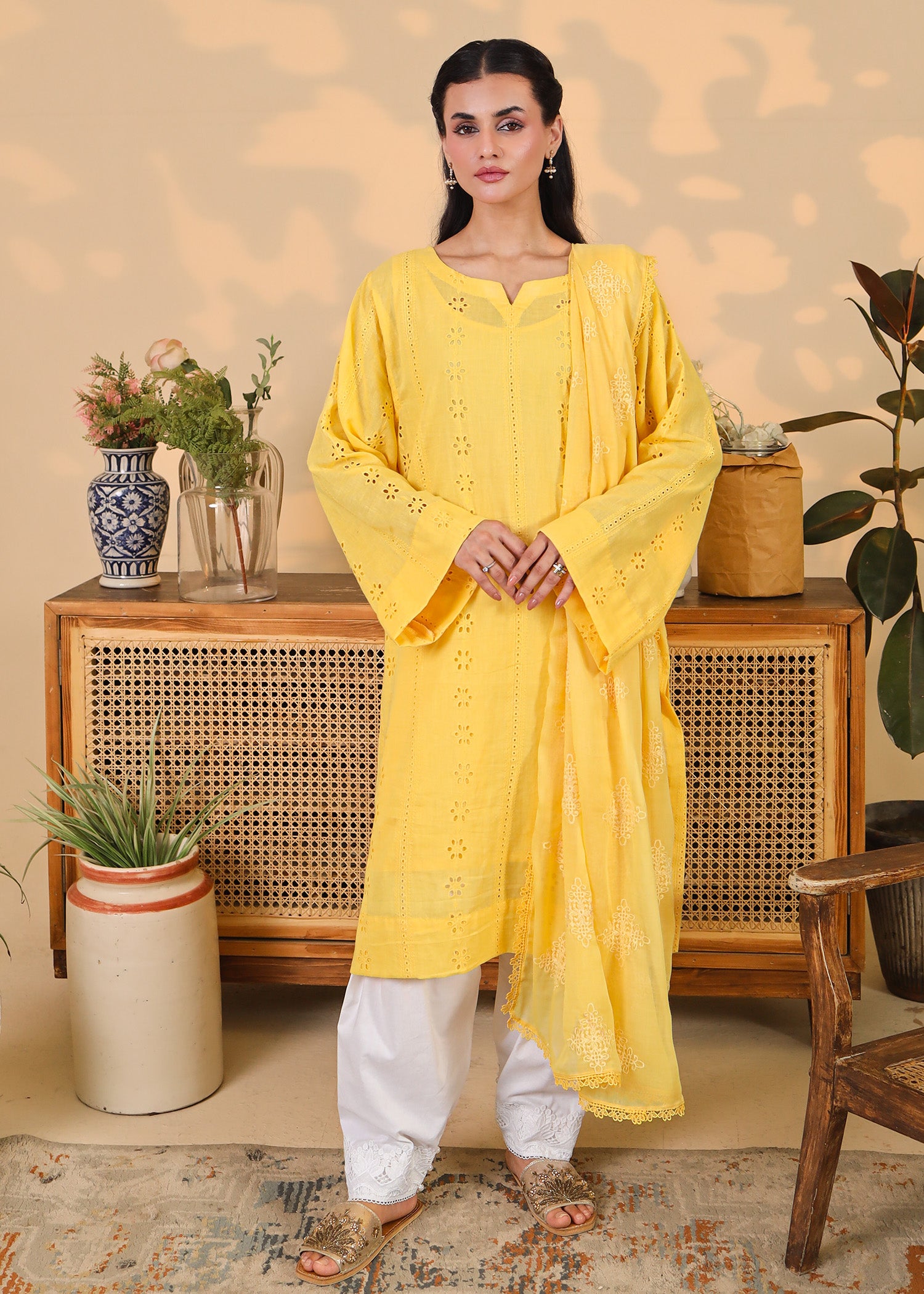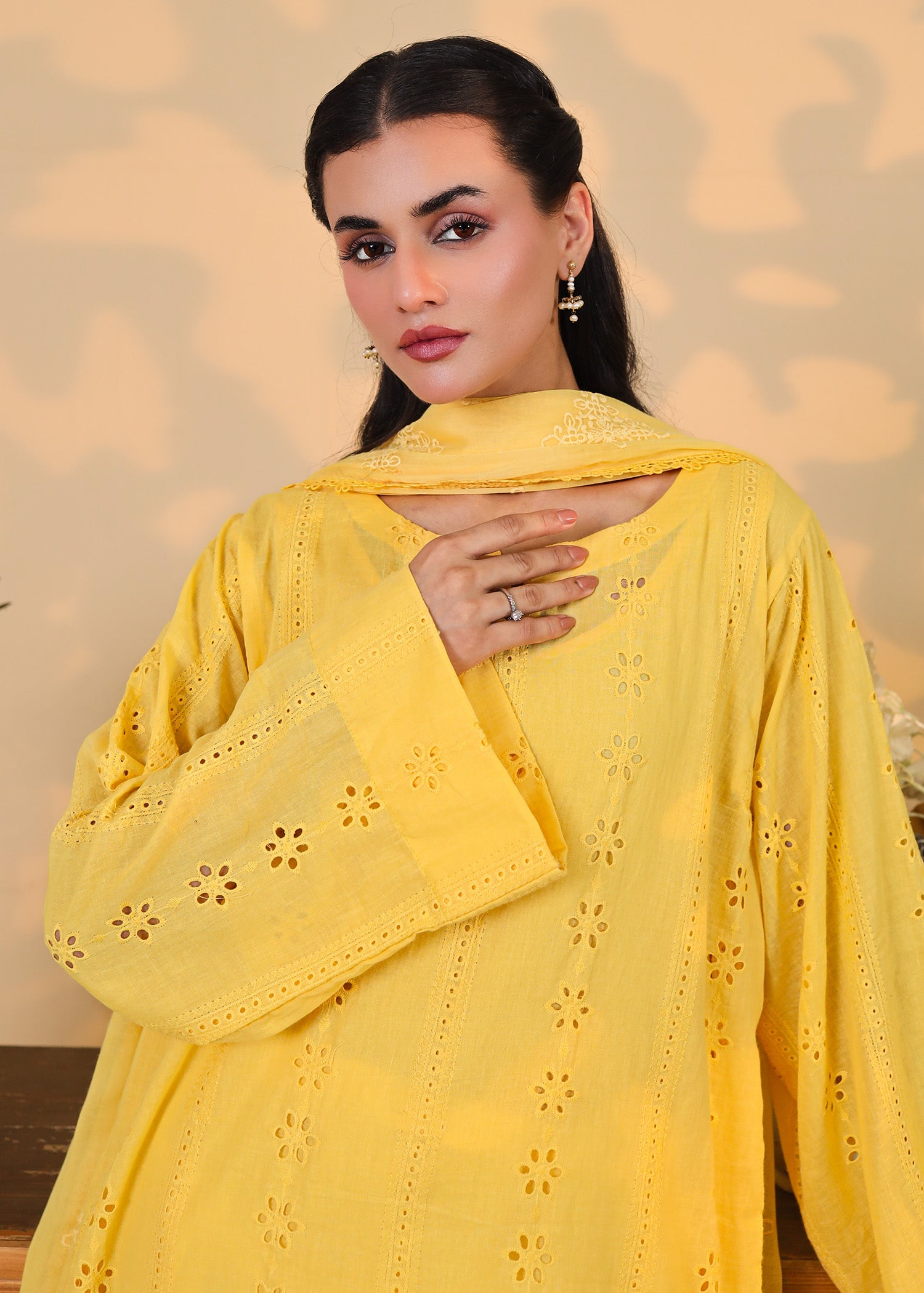 Bright, breezy, and beautifully detailed – this Sunshine Yellow Eyelet 3pc is your go-to ensemble for daytime festivities and summer gatherings. The shirt features intricate eyelet embroidery paired with a matching flowy dupatta adorned with delicate motifs. White straight-cut laced shalwar to complete the look.