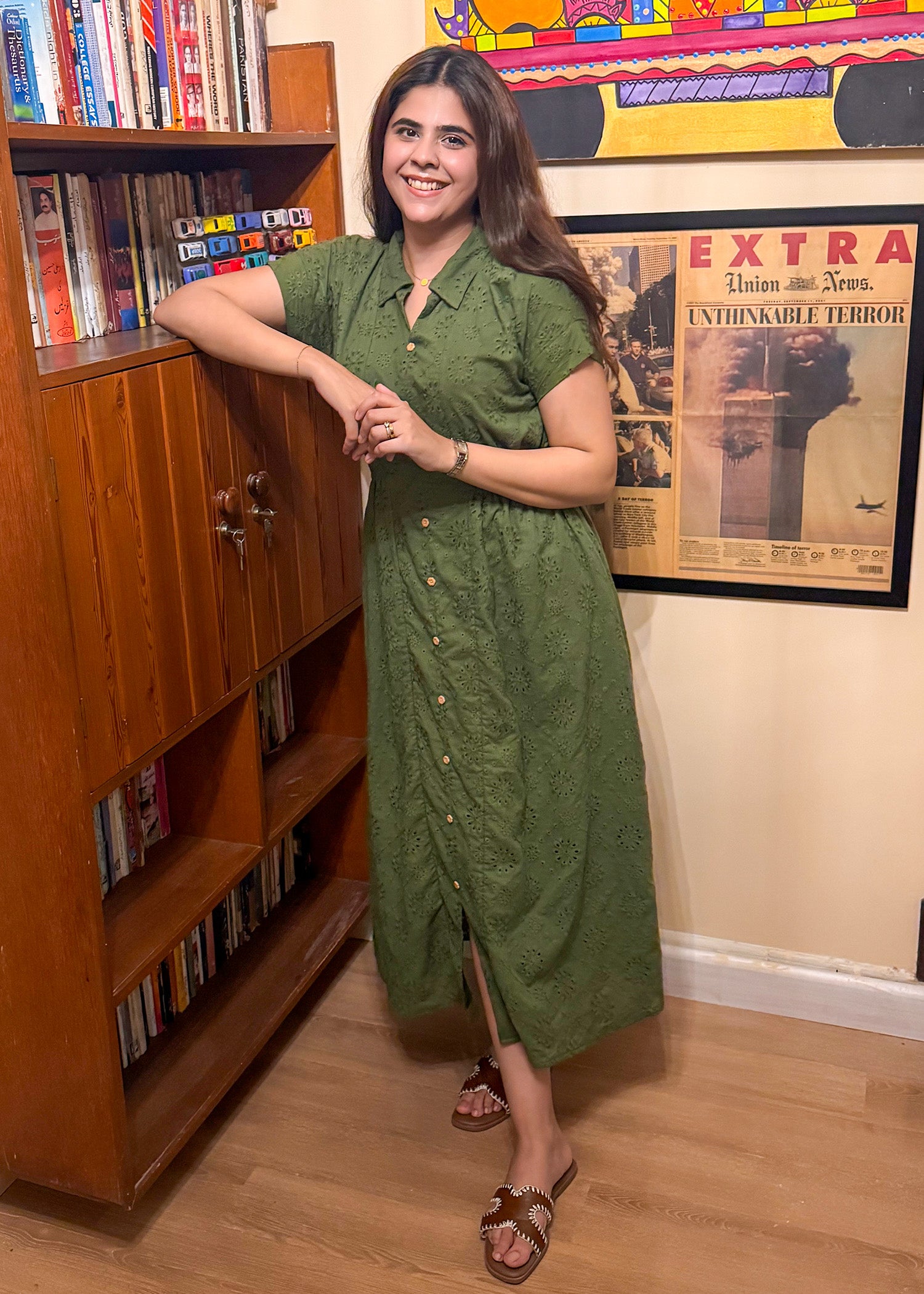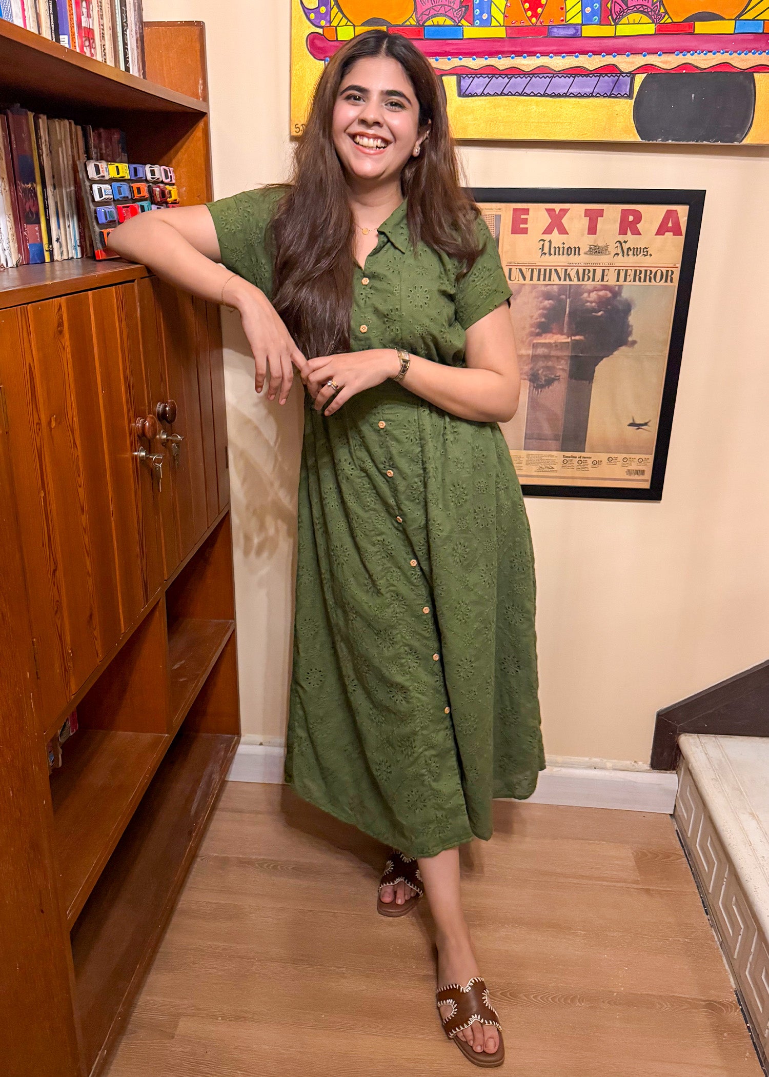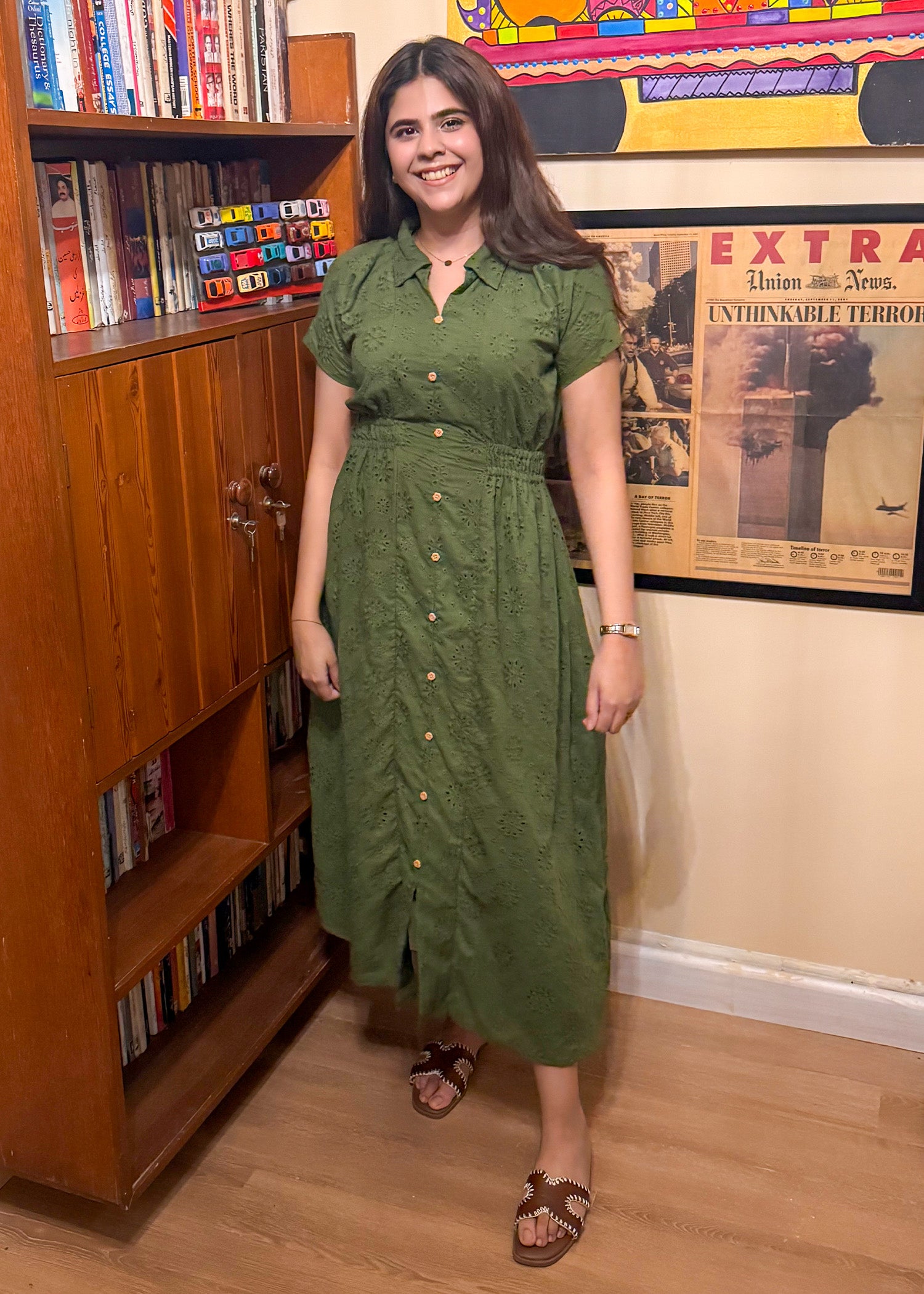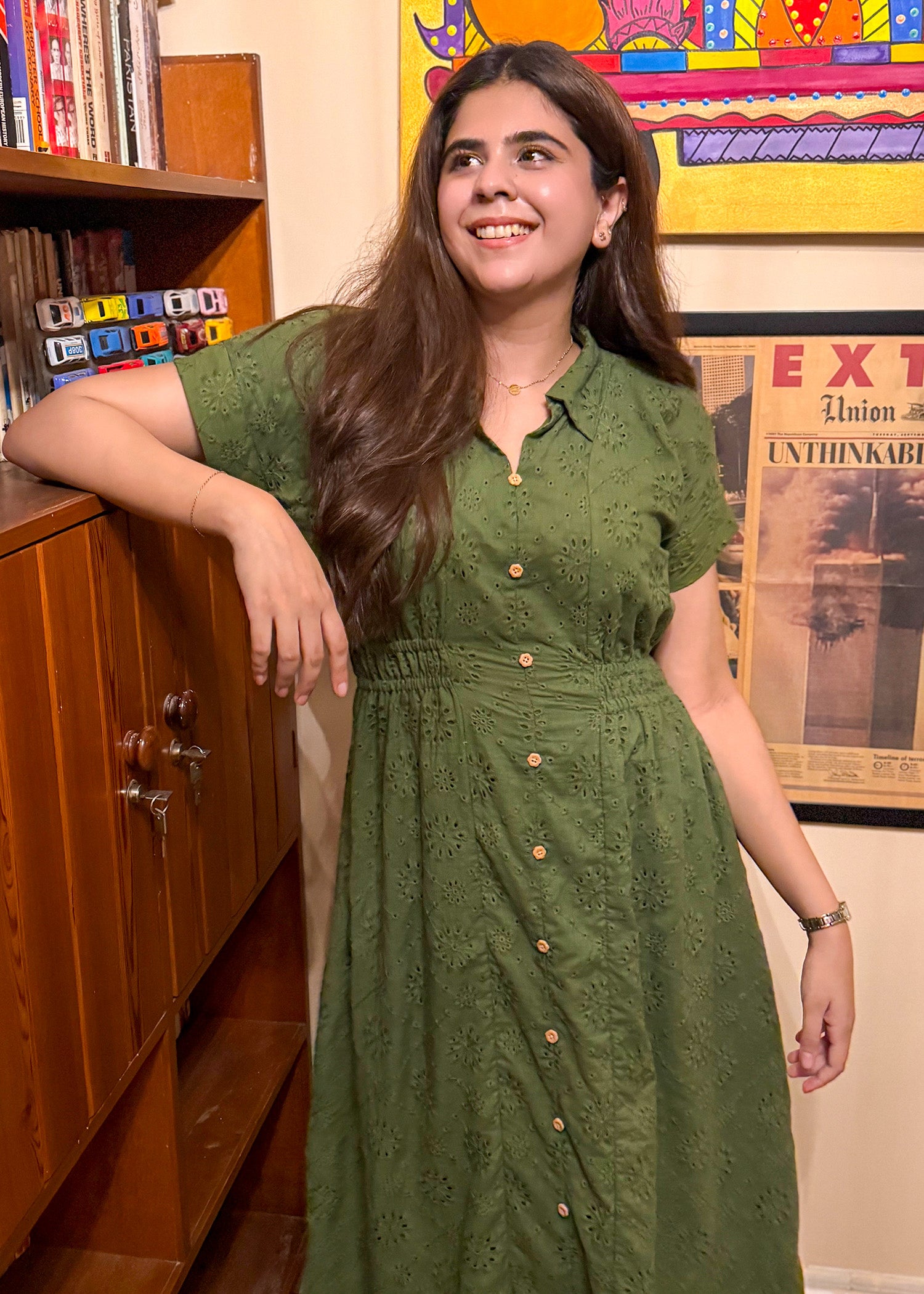 Effortlessly chic, the Tessa Dress is crafted from khaki green eyelet (chikankari) fabric, blending timeless embroidery with modern tailoring. The flattering V-neckline with a sharp collar adds structure, while short sleeves with turn-up cuffs lend a casual, summery feel. Embellished with decorative buttons down the front, and a subtle slit that flows into a flared dress skirt it is a versatile favourite for everything from brunch dates to evening strolls.