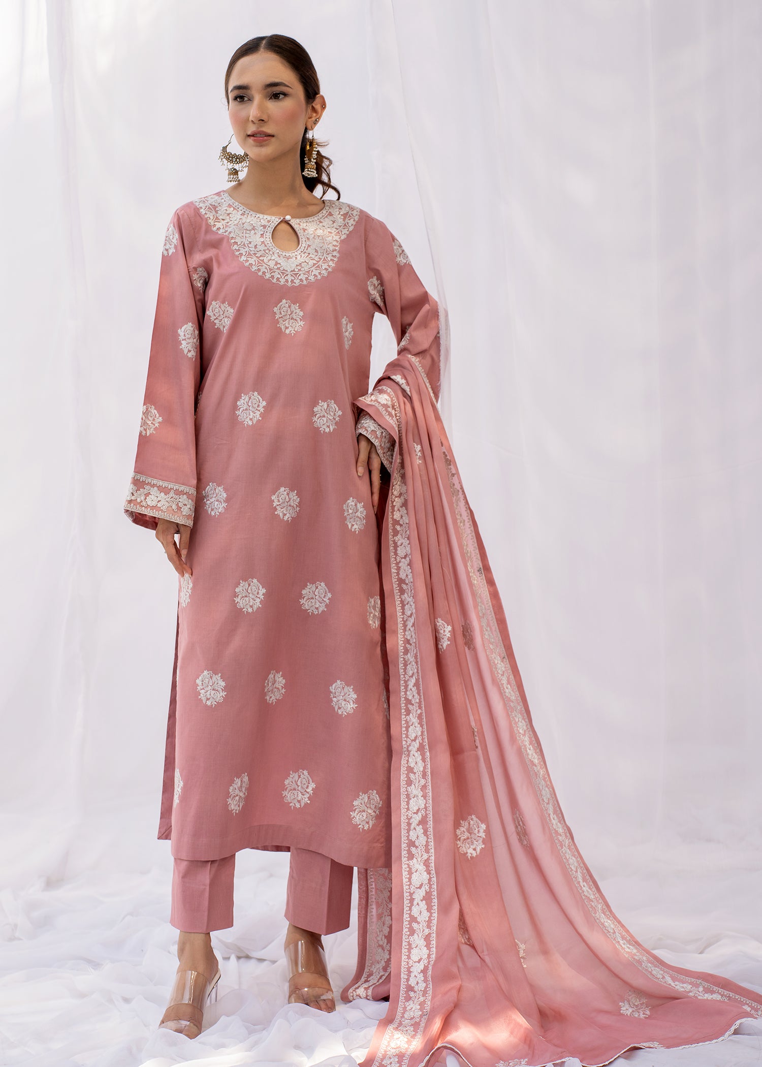 Our timeless pink 3-piece ensemble exudes elegance with its intricately embroidered neckline, adorned with a delicate pearl and all-over embroidery on the shirt. The loose-fit sleeves feature beautifully embroidered hems, adding an extra touch of sophistication. Paired with an embroidered silk dupatta that drapes flawlessly, this outfit embodies grace and style, perfect for any occasion.