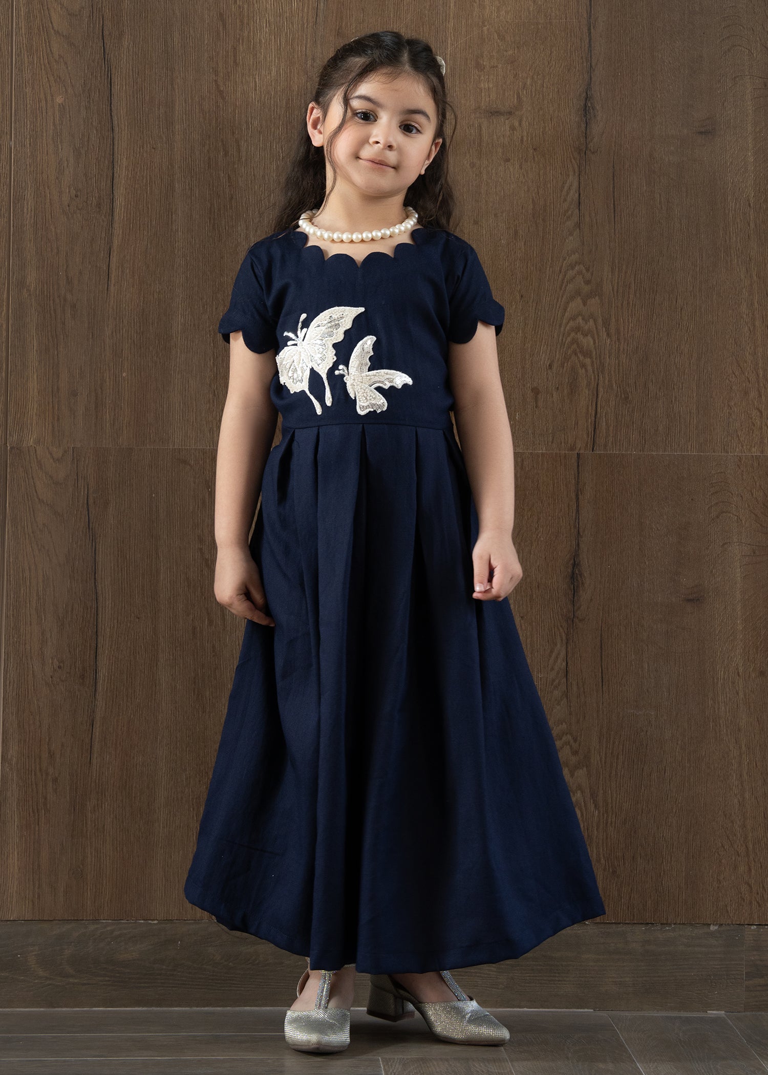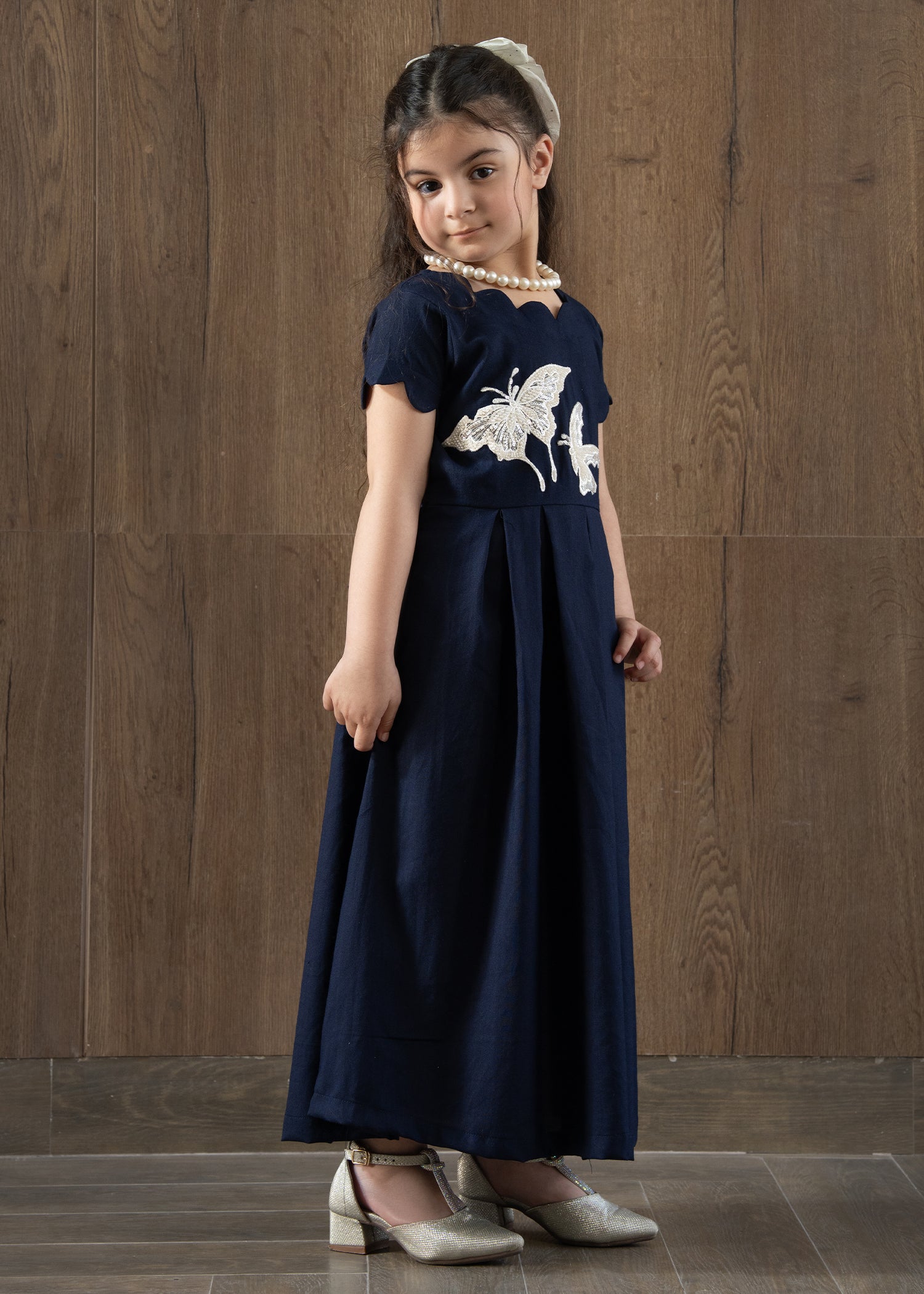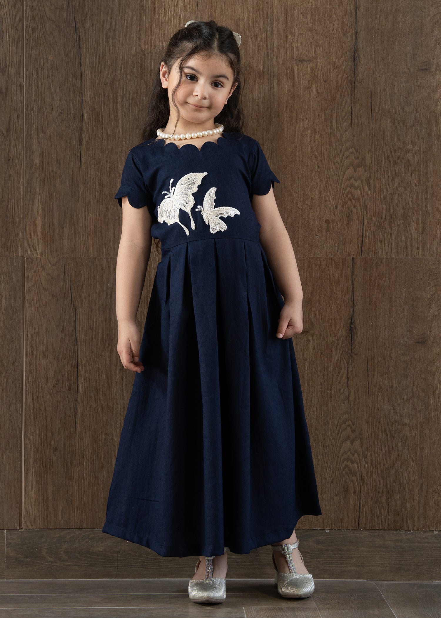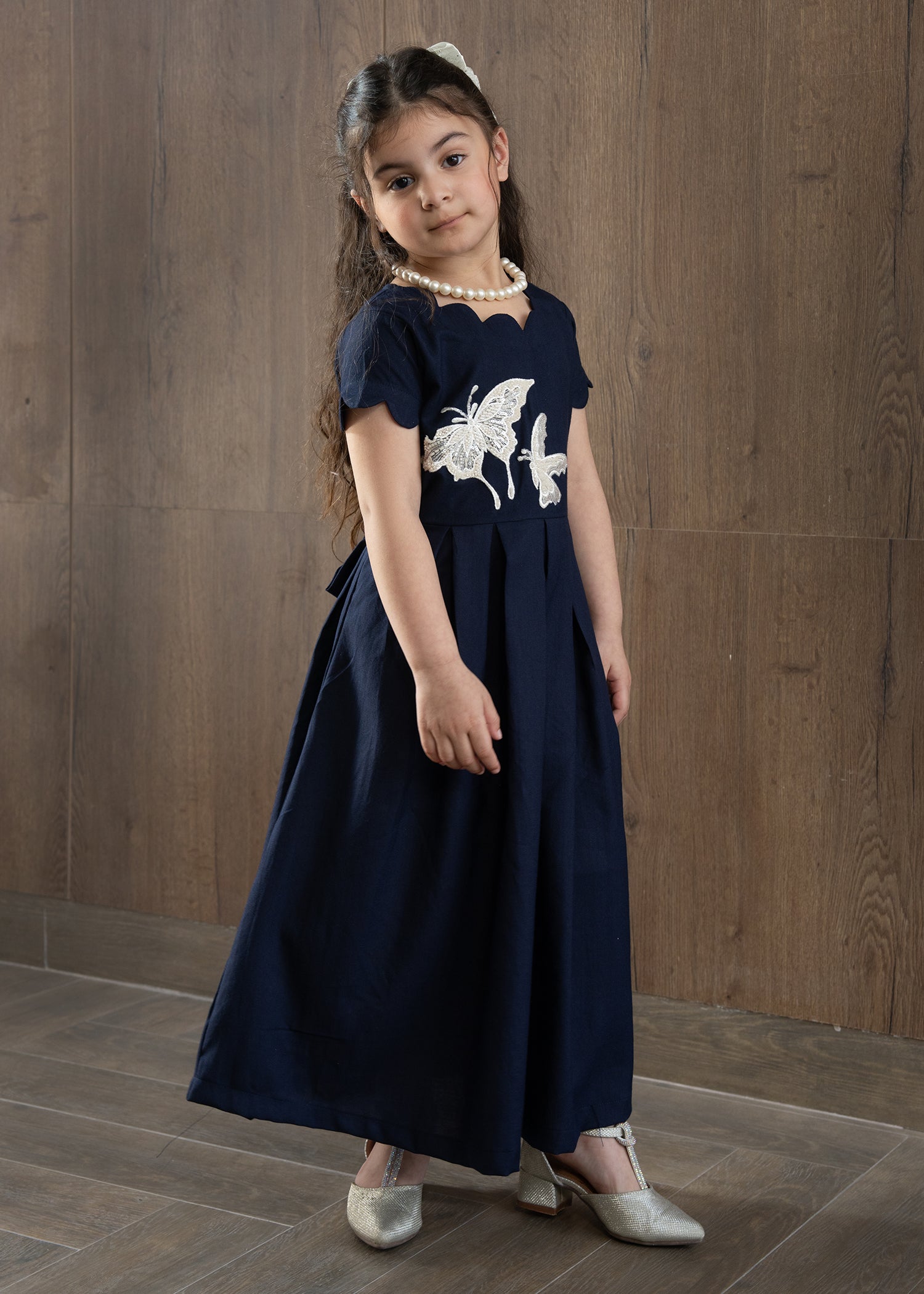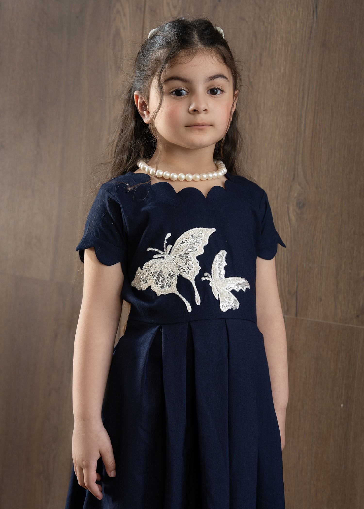 A charming navy dress designed for little festive moments. Featuring soft fabric and playful butterfly sequin patches, this flowy silhouette keeps her comfortable while adding a touch of sparkle for Eid celebrations.