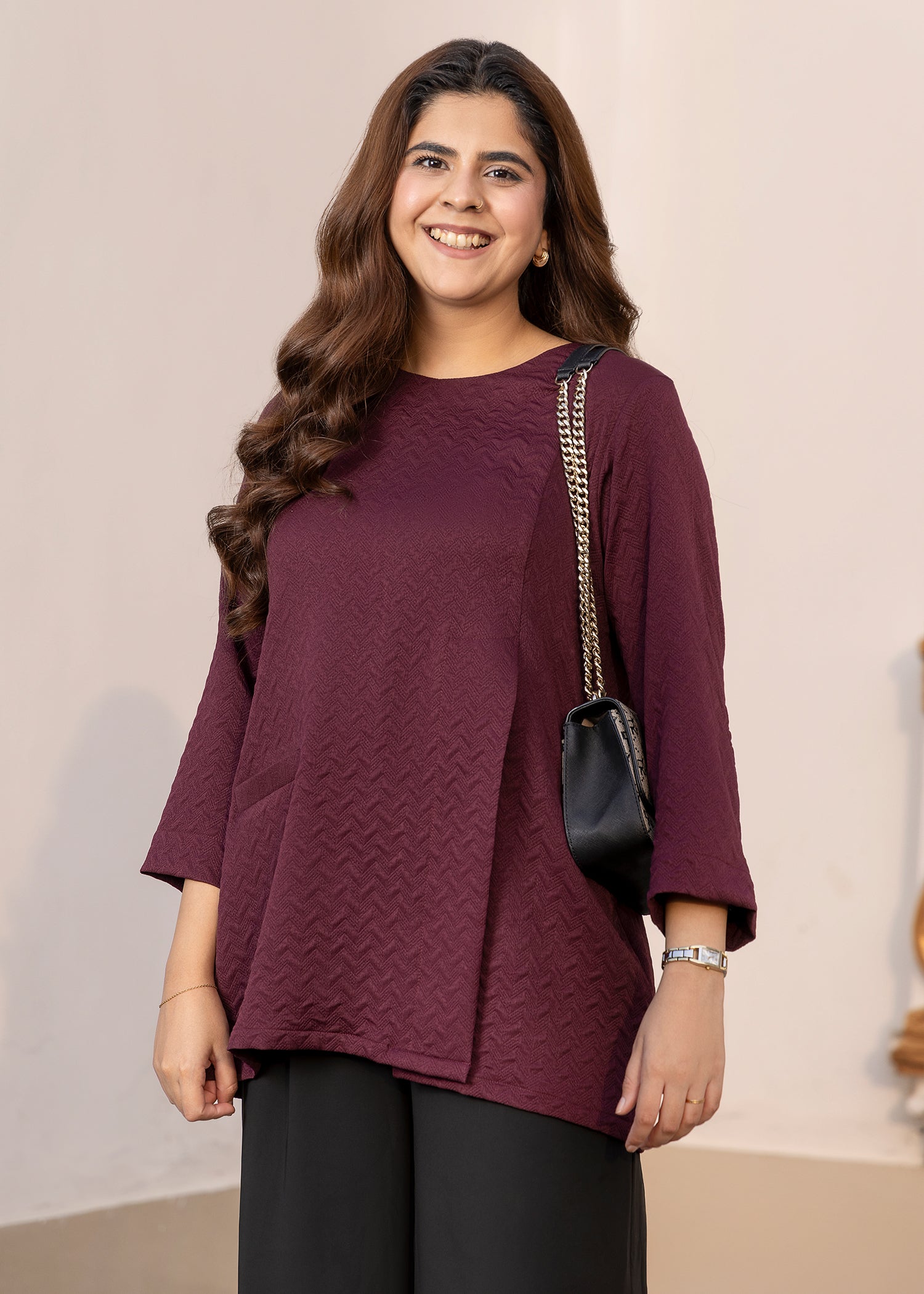 Chic and versatile, this burgundy textured top paired with classic black wide-leg trousers is designed for effortless sophistication. The loose-fit top features clean lines and a soft texture that adds depth to the rich burgundy hue, while the black trousers balance the look with a sleek, elongated silhouette. A timeless pairing that works from day to night with ease.